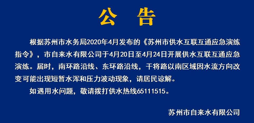 根据江苏省城市足球赛官网市水务局2020年4月发布的《江苏省城市足球赛官网市供水互联互通应急演练指令》,市自来水有限公司于4月20日至4月24日开展供水互联互通应急演练。届时,南环路沿线、东环路沿线,干将路以南区域因水流方向改变可能出现短暂水浑和压力波动现象,请居民谅解。