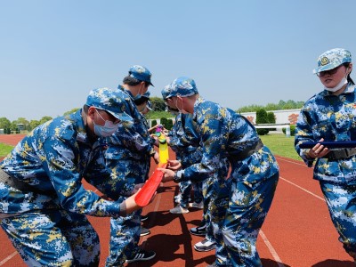 乘着大巴,团员青年们来到素质拓展场地,换上整齐划一的迷彩服,听取领导寄语、跟随教练的指引,令行禁止、学站军姿,大家整齐划一。一系列的破冰游戏快速拉近了来自不同部门的团员青年们彼此之间的距离。随后,青年们随机分成两支队伍,起队名、画队旗、喊口号,两队秉持齐心协力的团队精神和“友谊第一、比赛第二”的竞赛精神,进行了“不倒森林”、“鼓动人心”、“水到渠成”等团队协作项目比拼。