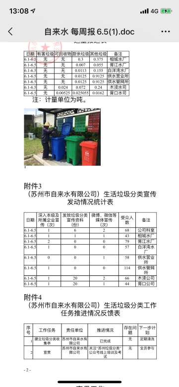 1.做好生活垃圾分类收运量报送表、生活垃圾分类宣传发动情况统计表、生活垃圾分类工作任务推进情况反馈表的每周报工作。公司每周垃圾回收情况为:有害垃圾约0吨、可回收垃圾约0.03吨、厨余垃圾约0.66吨、其它垃圾约2.67吨。