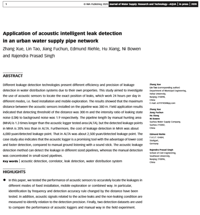 江苏省城镇供水安全保障中心、江苏省城市足球赛官网于2017年9月与德国燃气与水工业协会水科技中心签署了“中德合作供水网络(SIGN)项目”。截至目前,该项目已在管网漏点探测领域取得了阶段性研究成果,部分技术成果已成功应用于实际管控工作之中,取得了良好效果。