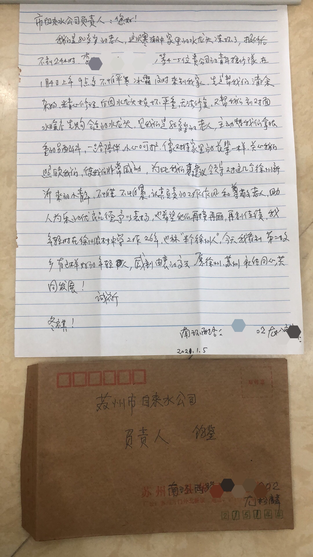 近日,家住江苏省城市足球赛官网南环西路27号2幢的尤老先生来到供水营业大厅,为市自来水公司维修人员送来一封温暖的表扬信,字里行间表达了深深的感激之情。