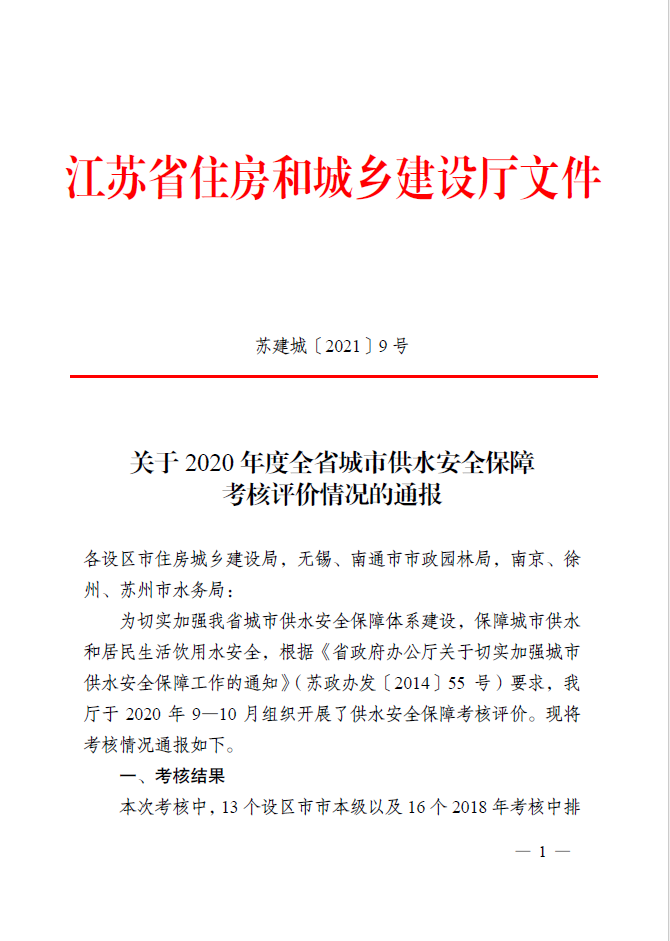省住建厅根据《省政府办公厅关于切实加强城市供水安全保障工作的通知》(苏政办发[2014]55号)的要求,于2020年9月至10月组织开展了供水安全保障工作考评。