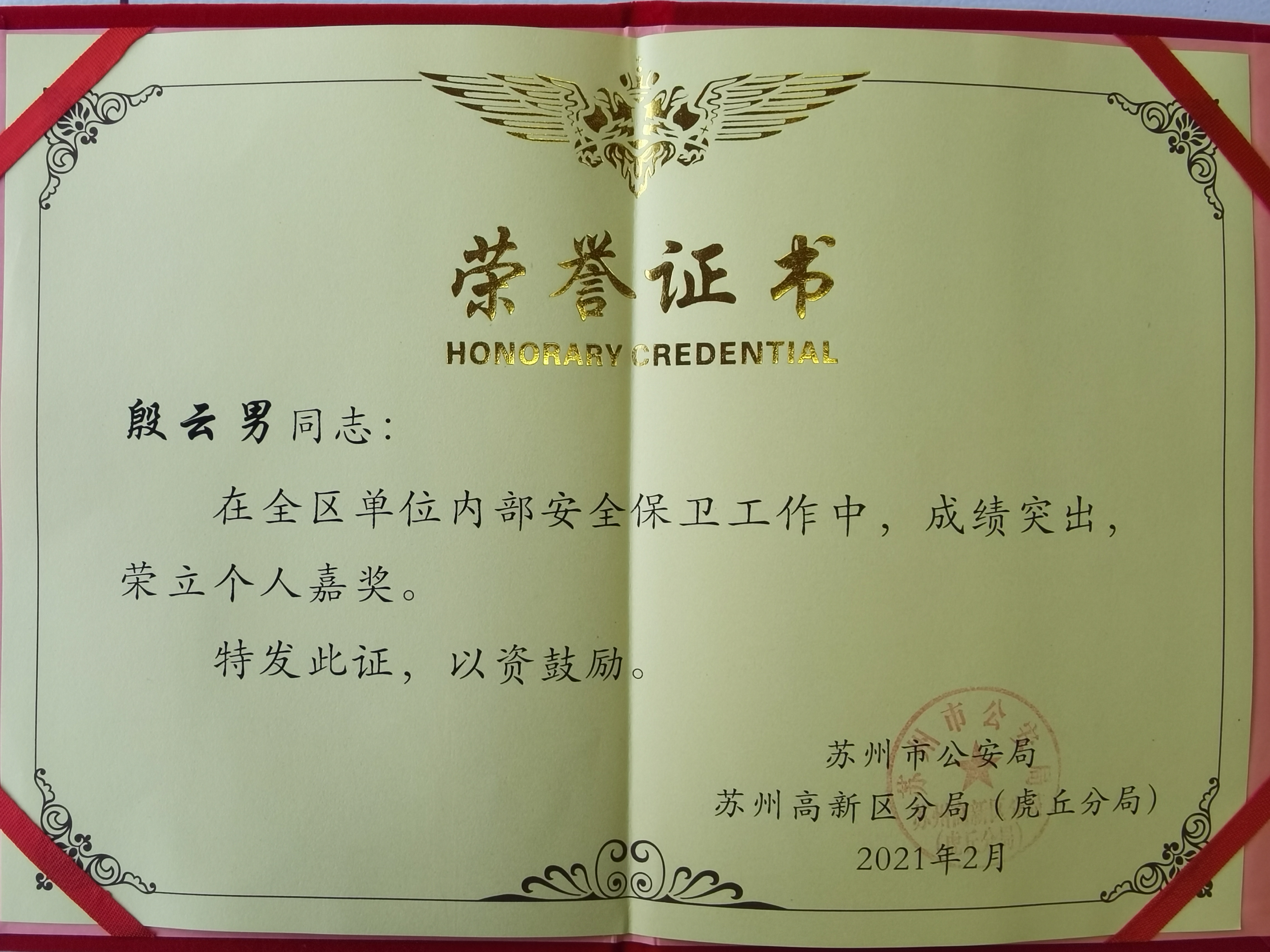近日,白洋湾水厂职工殷云男同志因在高新区单位内部安全保卫工作中成绩,获得了由江苏省城市足球赛官网市高新区公安局(虎丘分局)颁发的“个人嘉奖”先进表彰。
