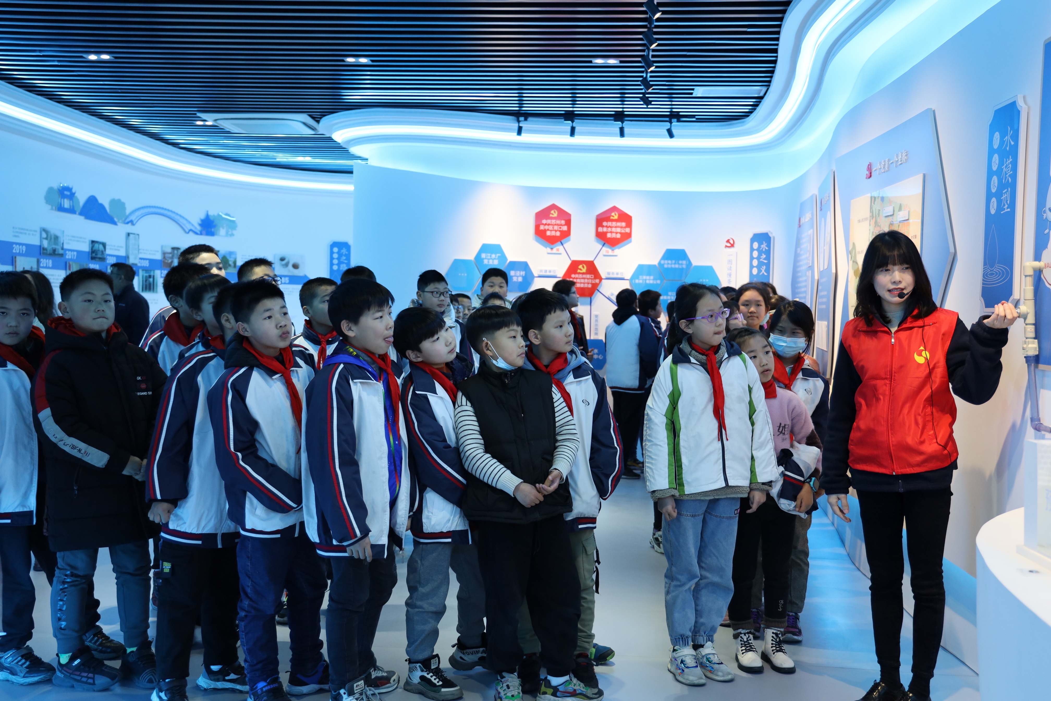 首先,小学生们来到胥口水司“水映中国红”党建馆聆听了胥口水司20年的发展历程,通过科普互动区初步了解了制水工艺流程,并在党群服务站的儿童图书角阅览了与水相关的图书。随后,在胥江水厂小学生们参观了沉淀池、砂滤池和炭滤池等制水构筑物,详细听取了志愿者关于水厂概况和制水工艺流程的介绍,品尝了香甜可口的直饮水,认识了自来水混合、反应、沉淀、过滤、消毒等一系列制水工艺,实地感受了浊水变清的过程,了解了自来水的来之不易,以此倡导大家关心水、爱惜水、保护水。