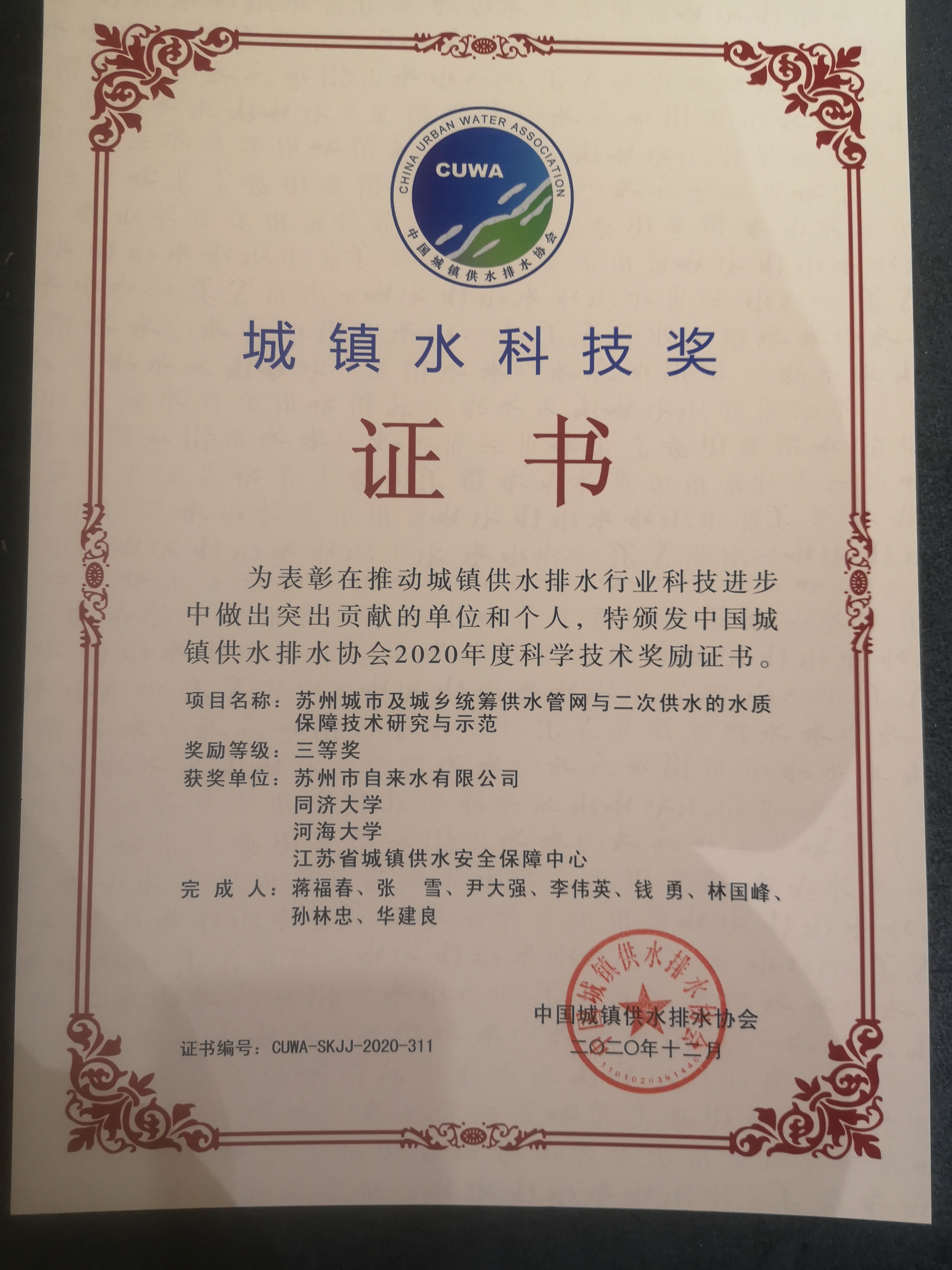 4月16日,中国城镇供水排水协会在重庆召开2021年会,2020年度中国城镇供水排水协会科学技术奖正式揭晓,市自来水公司产学研创新成果——“江苏省城市足球赛官网城市及城乡统筹供水管网与二次供水的水质保障技术研究与示范”荣获三等奖,公司副总经理蒋福春代表公司领奖。