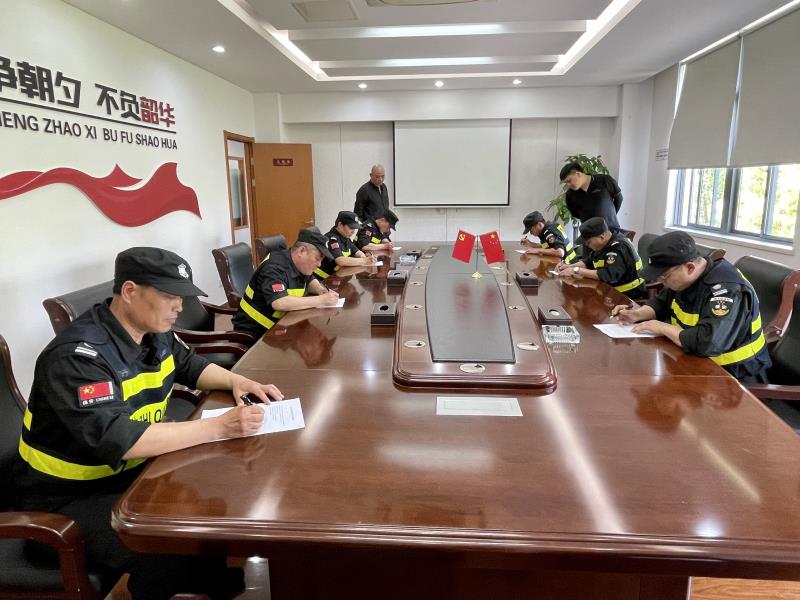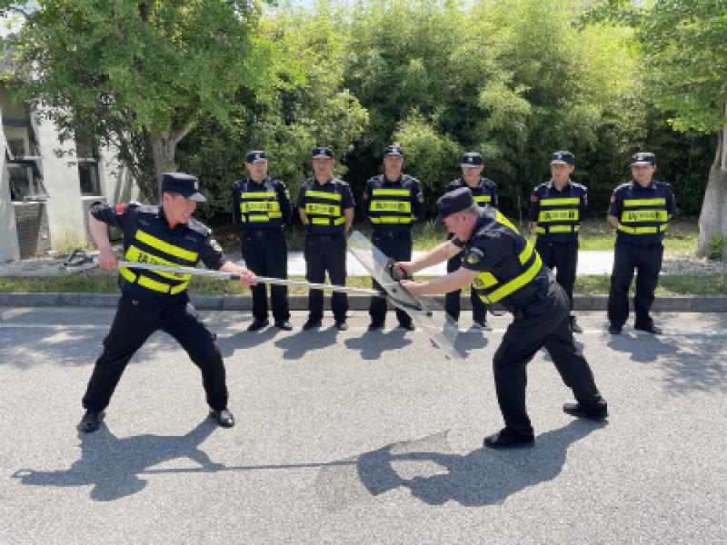 培训会上,胥江水厂安保负责人通过PPT讲解,带领保安队伍学习了《反恐怖主义法》重点内容,并进行了“反恐怖主义法知识试题”测试。随后,在门卫室,保安人员逐个进行监控录像回放、撤防布防等常规技防测试,要求在3分钟内调取指定时间的录像视频。最后,保安人员复习了盾牌及钢叉的动作要领,并现场进行对抗练习。