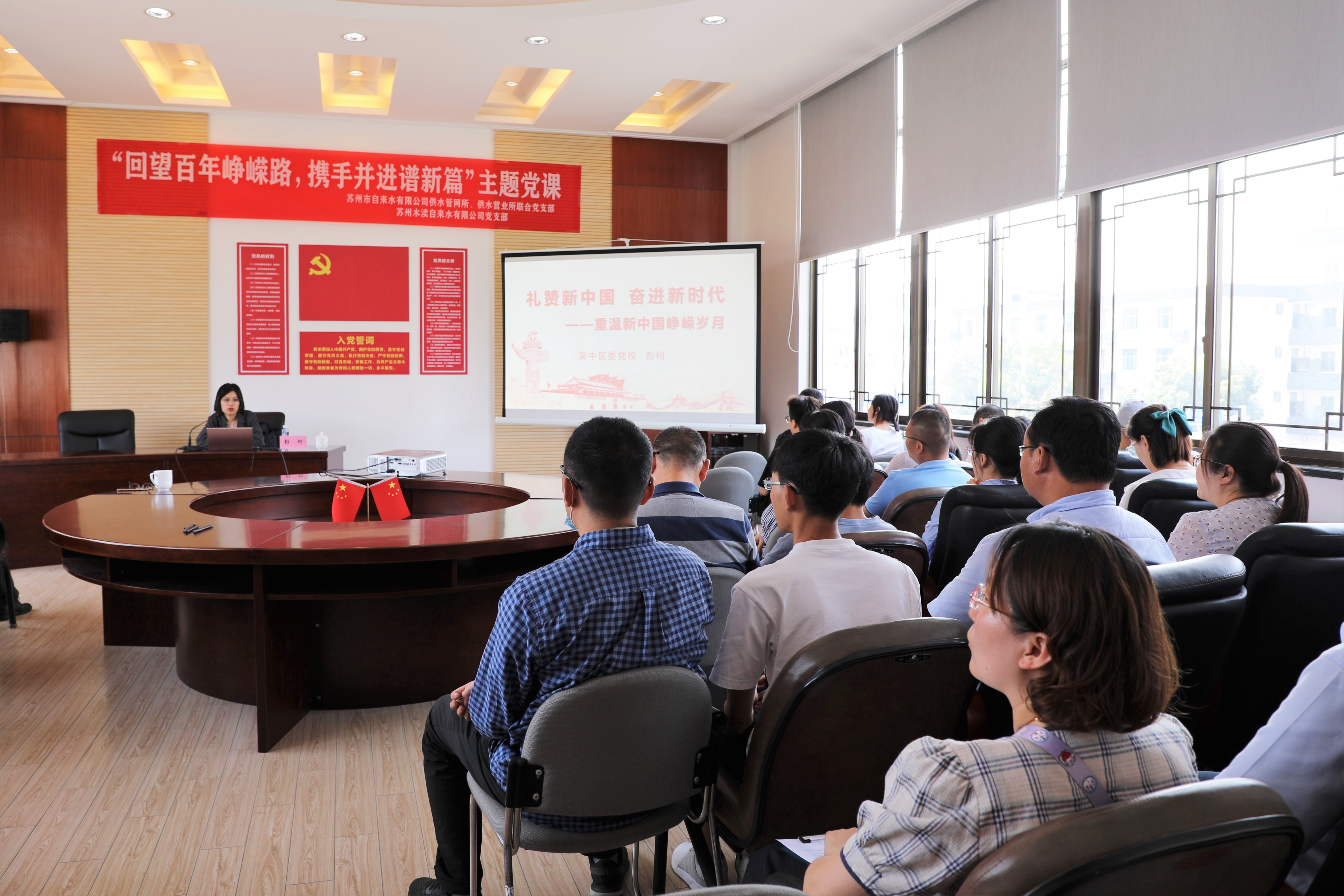近日,江苏省城市足球赛官网供水管网所、供水营业所联合党支部和江苏省城市足球赛官网木渎自来水有限公司党支部联合举办了以“回望百年峥嵘路,携手并进谱新篇”为主题的党史学习教育活动。本次活动邀请吴中区委党校彭柯老师为大家授课。