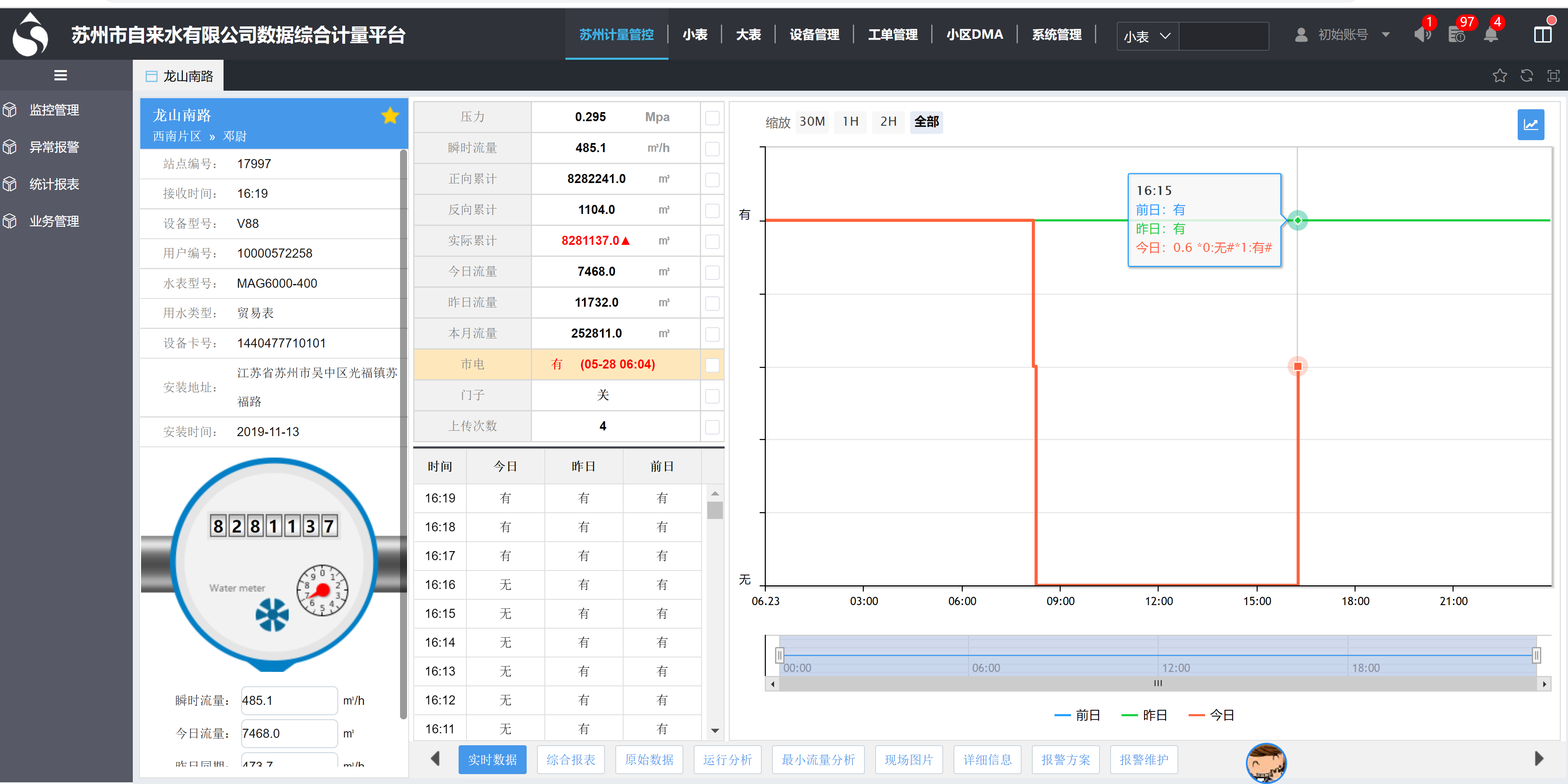 为全面解决此类问题,供水营业所表务科对所有在线流量仪机柜进行了全面普查,截至目前已完成29处在用的一级分区、贸易计量流量仪清点、核验工作。根据现场勘查情况,技术人员对流量仪机柜进行功能升级:一旦下位机失电立即发出报警,并与综合计量平台进行数据对接,在为抢维修争取更多时间的同时也减少了计量数据损失,进一步提高流量仪的在线稳定性。