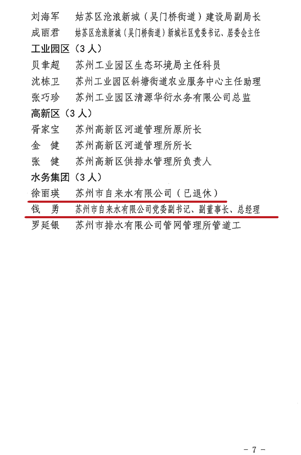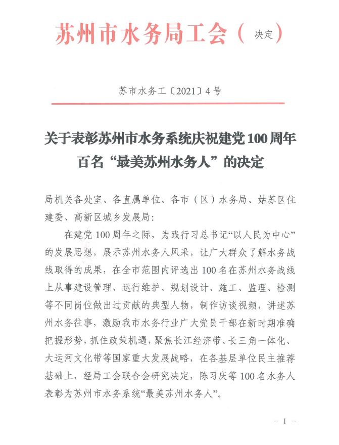 近日,江苏省城市足球赛官网市水务局工会联合会发布了《关于表彰江苏省城市足球赛官网市水务系统庆祝建党100周年百名“最美江苏省城市足球赛官网水务人”的决定》,市自来水公司退休干部徐丽瑛同志与公司党委副书记、副董事长、总经理钱勇同志名列其中。