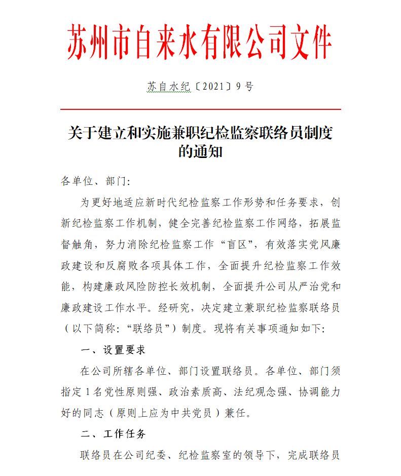 为更好地适应新时代纪检监察工作形势和任务要求,促进党风廉政建设责任制落实和工作开展,市自来水公司纪委积极创新体制机制,设立纪检监察联络员制度。