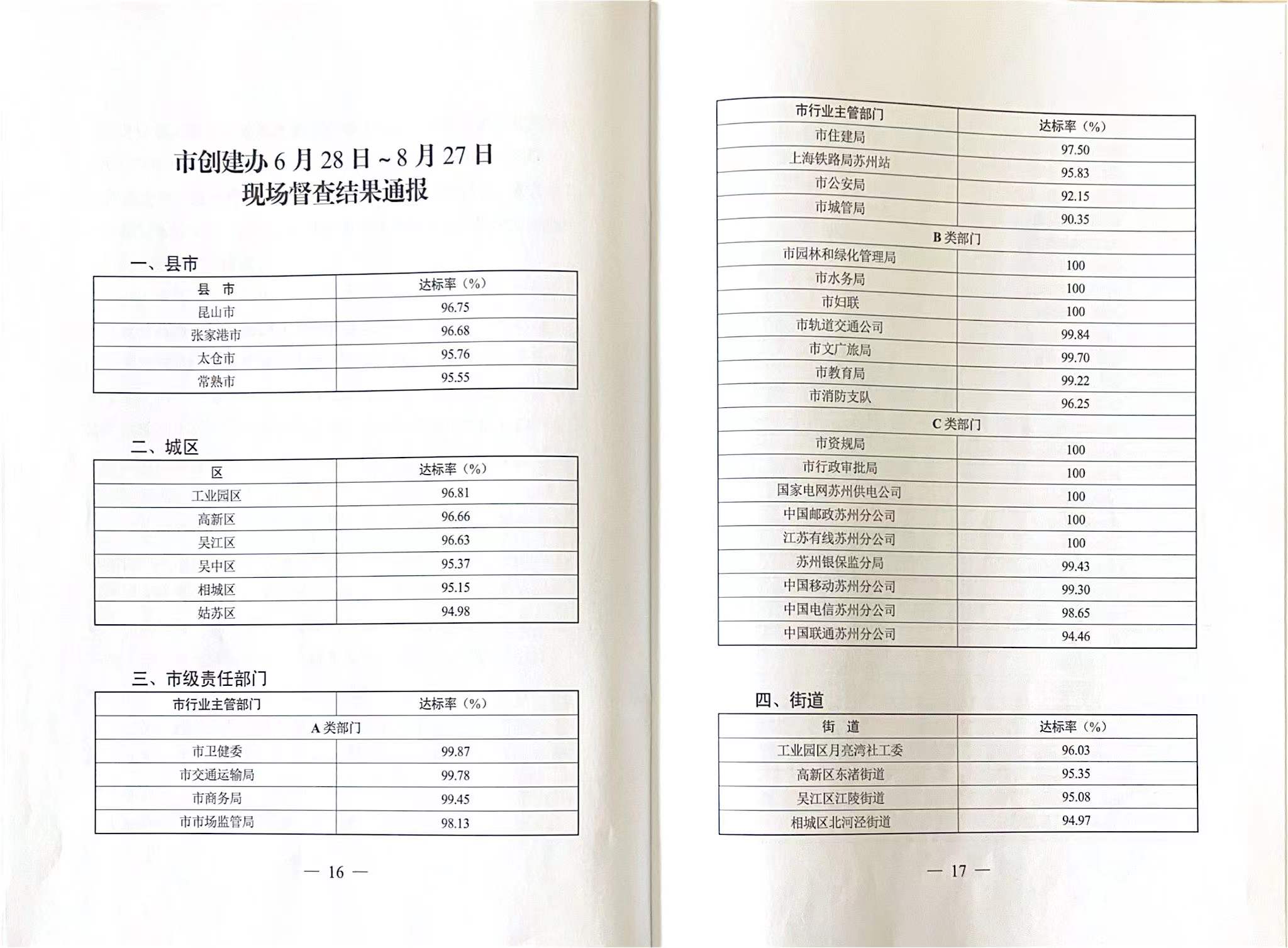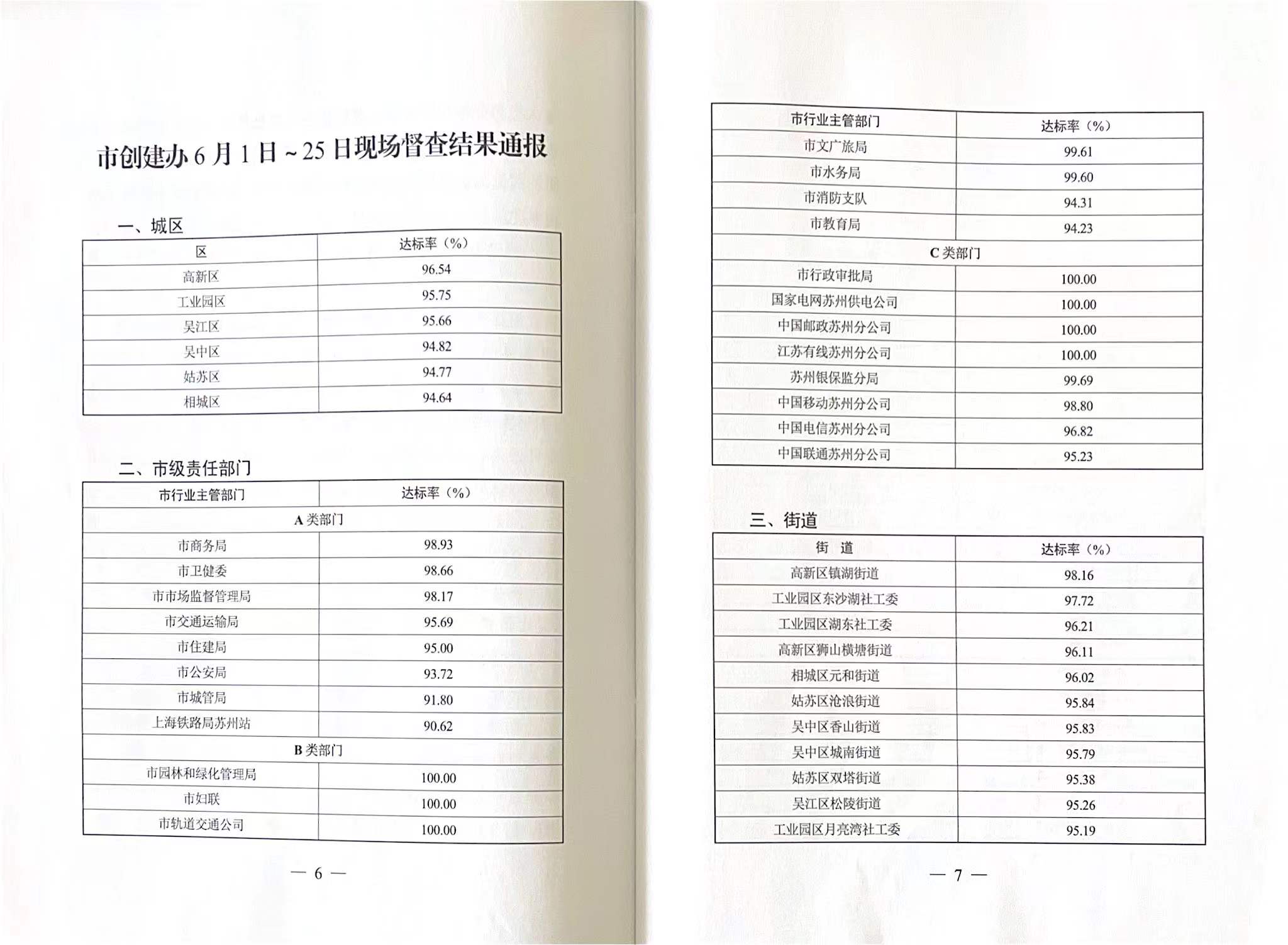市自来水公司积极配合相关工作,在第一次现场督查中达标率99.60%;第二、第三次现场督查达标率均为100%,在B类部门中排名第一。从公司抽调的蔡锡强同志工作认真负责,以足迹丈量“美丽江苏省城市足球赛官网”,以服务打通文明城市创建“最后一米”,保质保量完成工作任务,收到了市创建办寄送的感谢信。