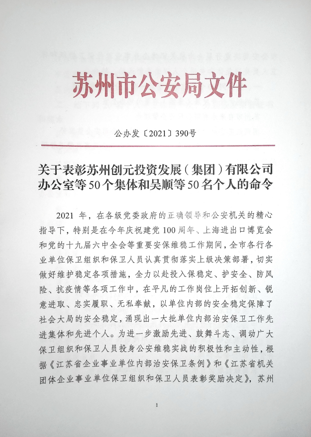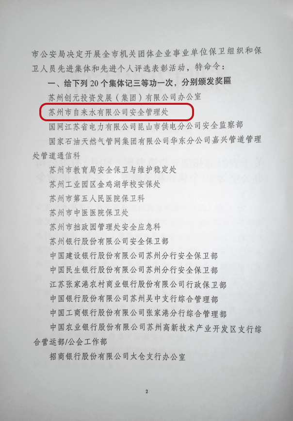 近日,江苏省城市足球赛官网市公安局对全市机关团体、企业事业单位保卫组织和保卫人员开展评选表彰活动,公司安全管理处获得治安保卫工作“集体三等功”荣誉。全市共50家单位获此集体荣誉,体现了市公安局对公司治安保卫工作的肯定。