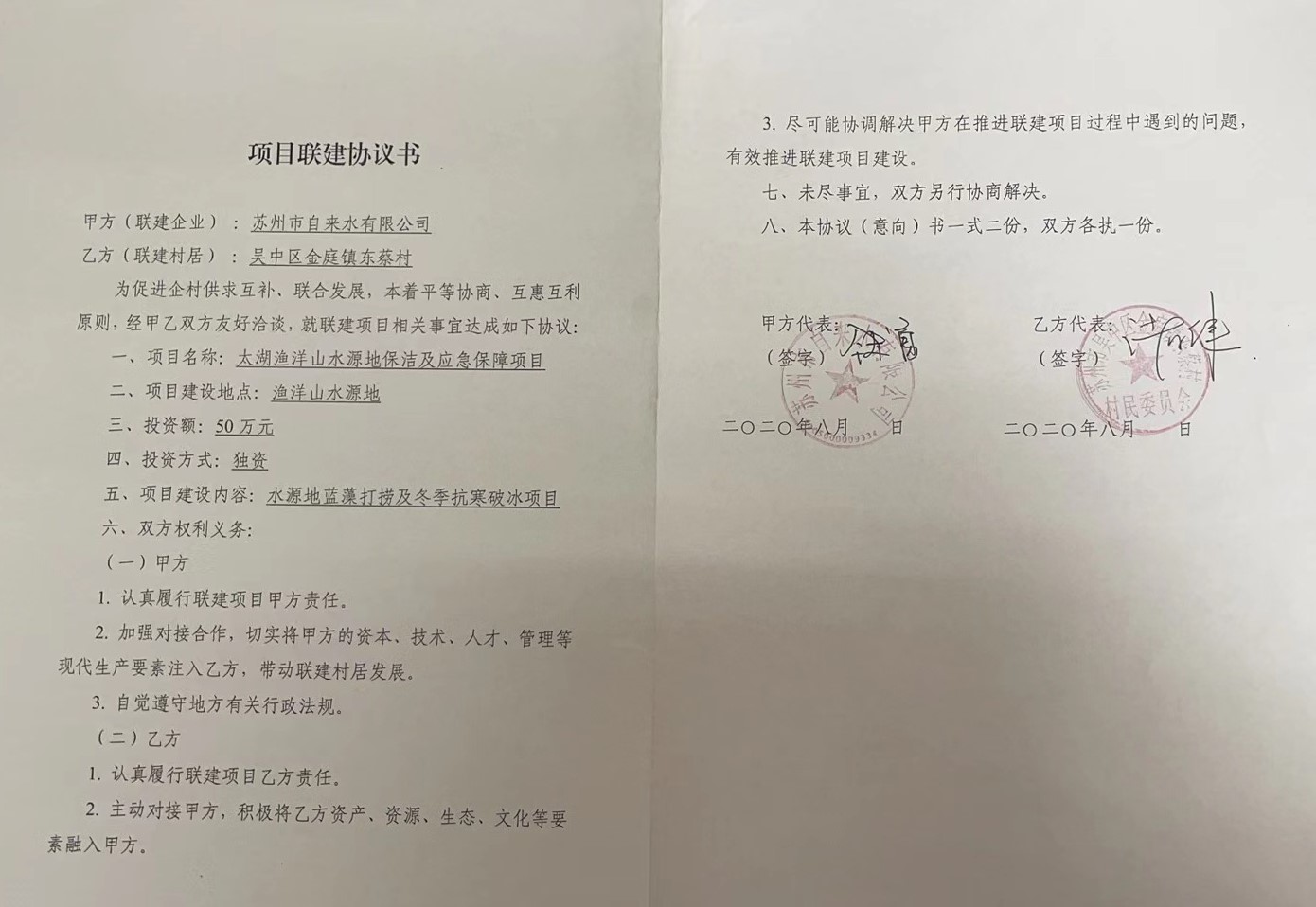 为积极响应市委市政府“万企联万村、共走振兴路”行动号召,2020年8月,市自来水公司与吴中区金庭镇东蔡村签订联建合作协议,切实发挥双方技术设备和人力资源配备优势,推动乡村振兴发展、牢筑水源地安全防线。