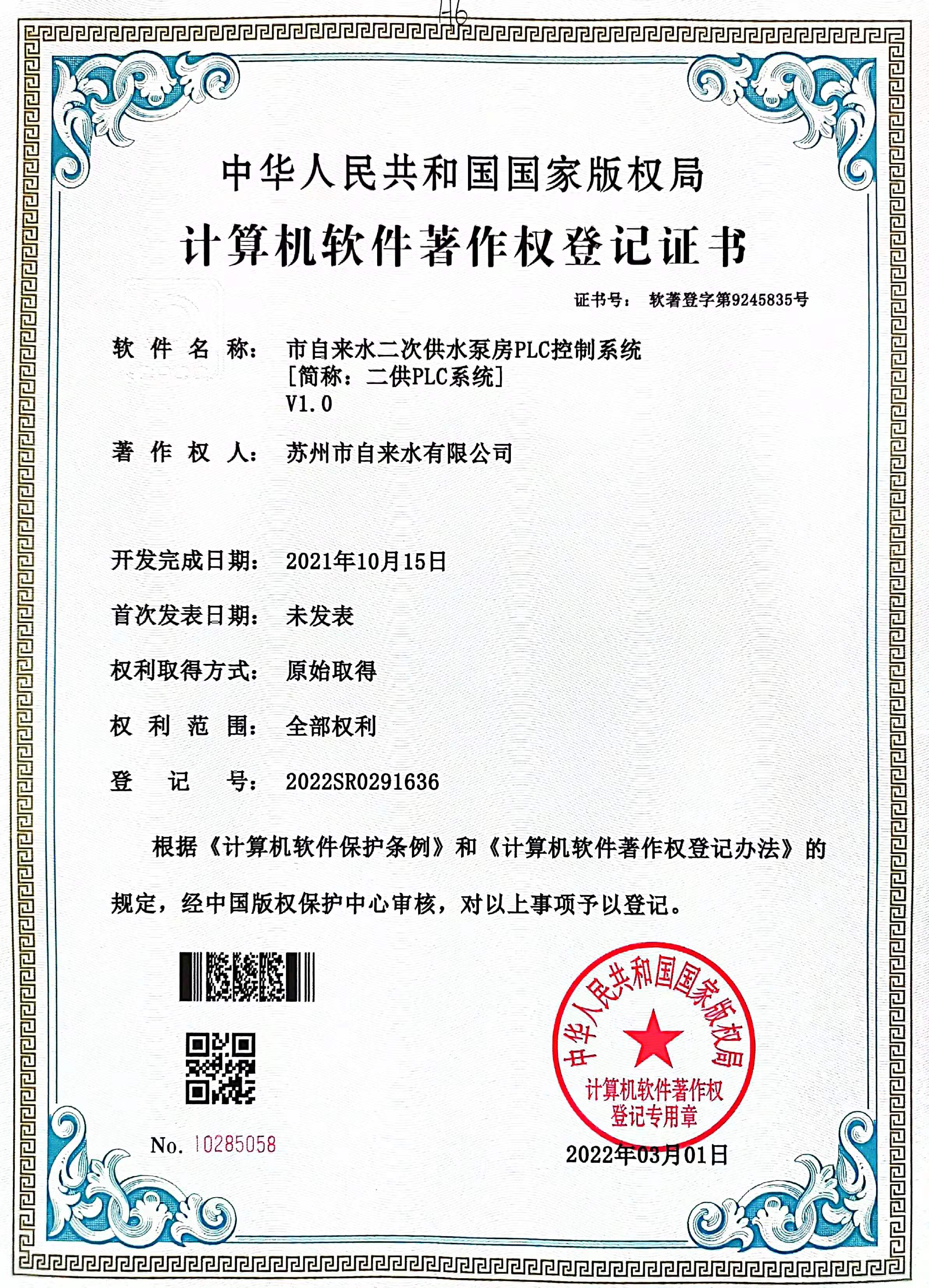 近日,经过国家版权局严格审查,市自来水公司申请的《市自来水二次供水泵房PLC》控制系统正式获得计算机软件著作权登记证书。