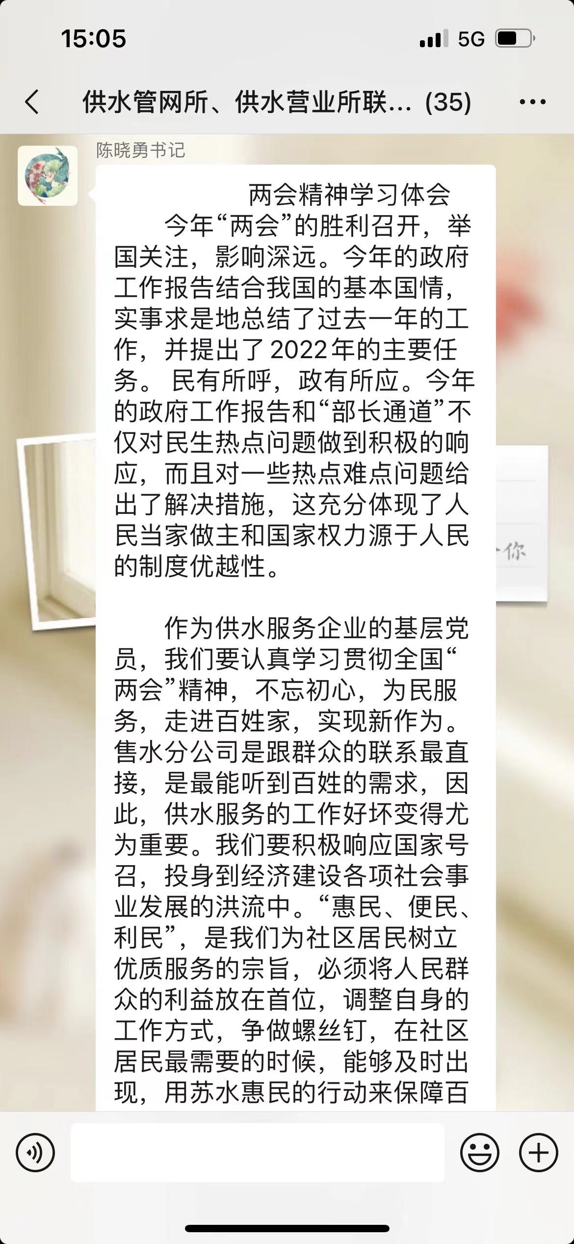 科室第二党支部通过个人学习和分组学习相结合的方式,支部书记带领全体党员重点解读了2022年《政府工作报告》,学习了李克强总理回答中外记者会上的金句,专门学习了全国人大代表黄茂兴关于综合施策优化营商环境的建议。支部书记号召全体党员深入贯彻“两会”部署和要求,以实际行动推动供水事业高质量发展的同时,发挥党员先锋模范带头作用,积极配合疫情防控,在助力疫情防控中践行初心使命。