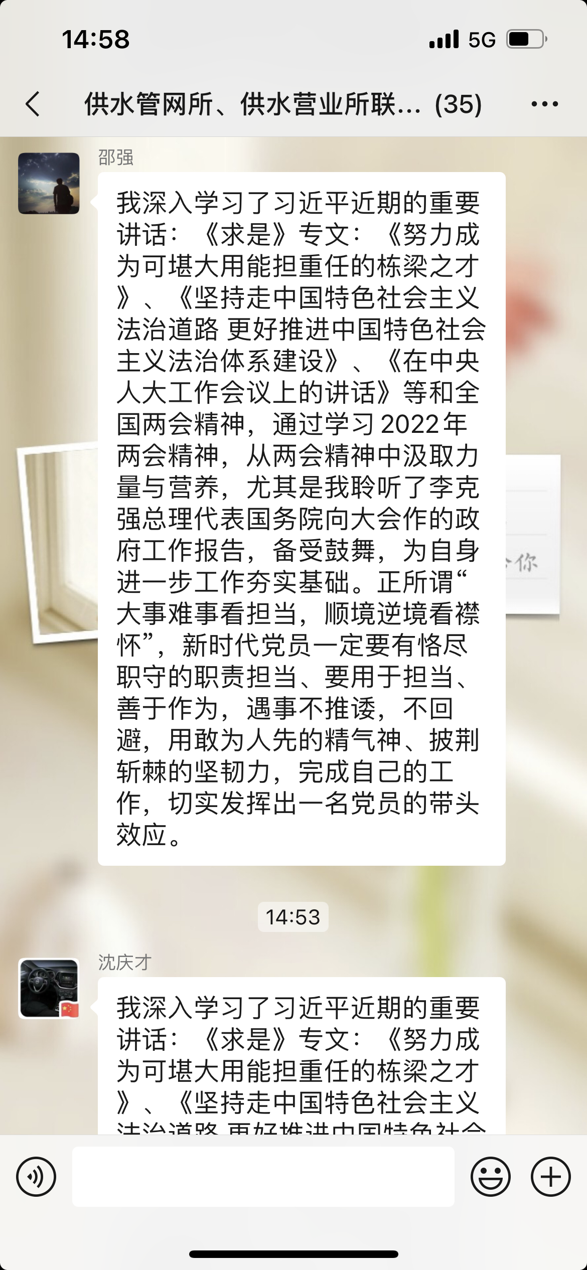 供水管网所、供水营业所联合党支部学习了习近平重要讲话与《求是》文章:《努力成为可堪大用能担重任的栋梁之才》、《坚持走中国特色社会主义法治道路 更好推进中国特色社会主义法治体系建设》等,并按照疫情防控要求,线上观看“两会”视频,学习党中央最新文件,撰写学习心得,深刻领悟“两个确立”的决定性意义,坚持稳字当头、稳中求进,把握新发展阶段、贯彻新发展理念、构建新发展格局、推动高质量发展,统筹疫情防控和供水服务,埋头苦干、勇毅前行。