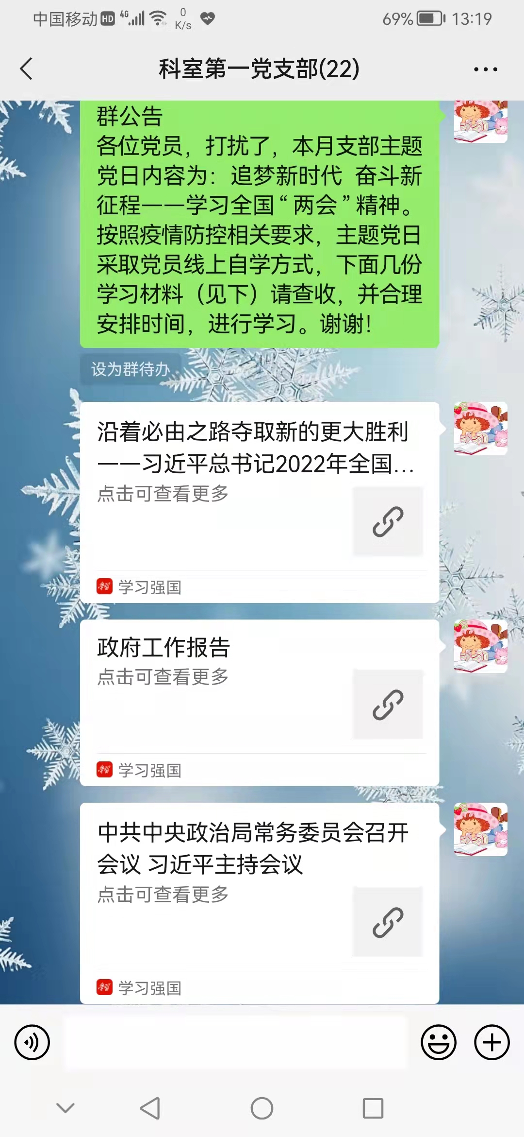科室第一党支部通过视频会议方式开展学习全国“两会”精神线上主题党日活动,专题学习了习近平总书记在全国“两会”期间的重要讲话和全国“两会”精神,并结合当前疫情形势,认真学习了习近平总书记的《关于从严抓好疫情防控》的指示精神,大家纷纷表示,将增强信心、迎难而上,时刻绷紧疫情防控这根弦,进一步强化各项工作措施,抓细抓实疫情防控各项工作。同时,继续发挥好党员先锋模范作用,积极投身各项疫情防控志愿服务活动,共同为打赢这场“战疫”贡献力量。