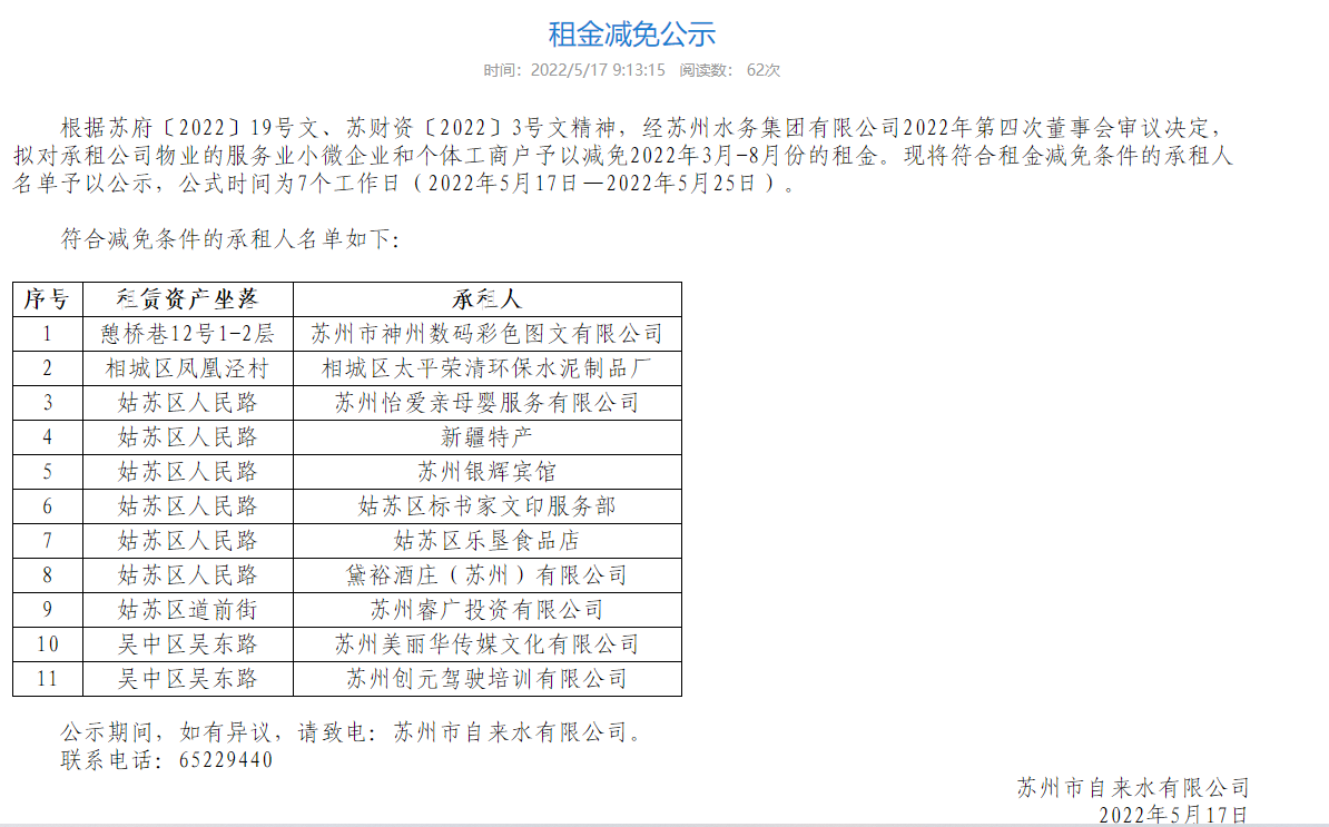 本次减免对象为承租公司权属物业的服务业小微企业和个体工商户,减免方式为免收2022年3月-8月的租金。为切实做好此项工作,公司第一时间梳理、审核承租户提供的相关主体资料,并按程序上报审批。在门户网站及出租资产坐落地,对符合减免条件的11家承租户进行了公示,有序开展减免相应工作,保障承租户精准享受免租政策。