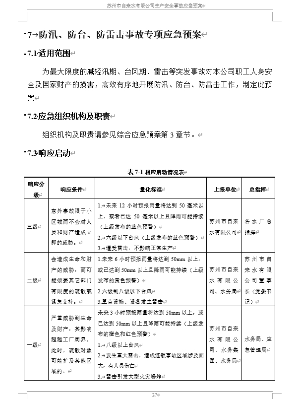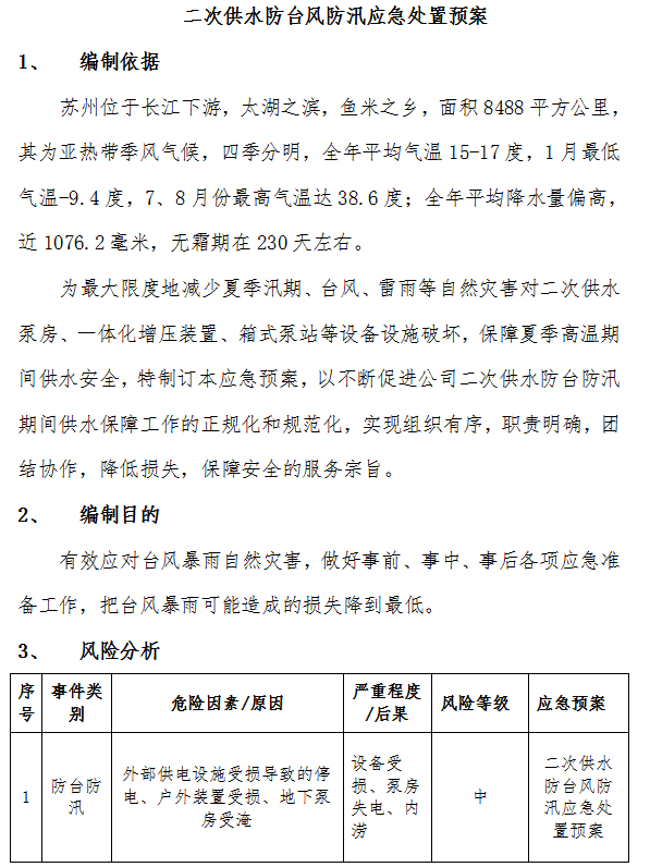 公司提早研判、提早预警、提早防范,编制《二次供水防汛防台应急预案》,进一步完善《江苏省城市足球赛官网生产安全事故应急预案》中防汛应急相关内容,明确监测、预报、联动等具体措施,统筹部署汛期值班值守、信息上报、部门应急处置等工作流程,全力筑牢汛期“防御工事”。