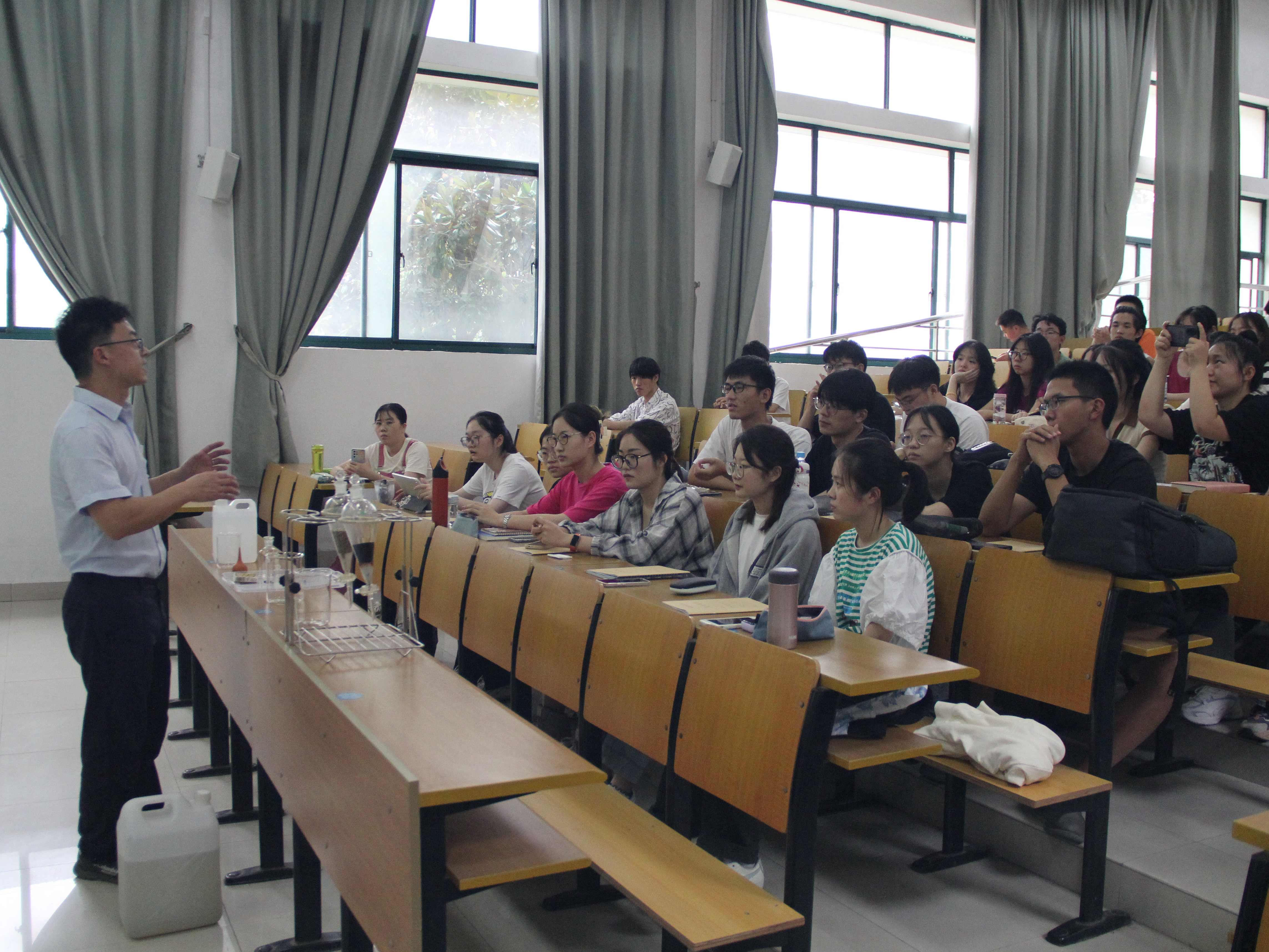 课堂开始,化验人员向学生展示了一场小实验,模拟砂滤池、碳滤池水处理工艺。经硫酸铝作用,原水沉淀形成矾花,变得更加清澈,充分吸引了同学们的目光。接着,工作人员以3D示意图、视频介绍等多种方式详细讲解了从源头到龙头的水处理工艺全过程,以及配水井、沉淀池、碳滤池等净水单体的特征、作用,让学生们身临其境般感受自来水净水流程。