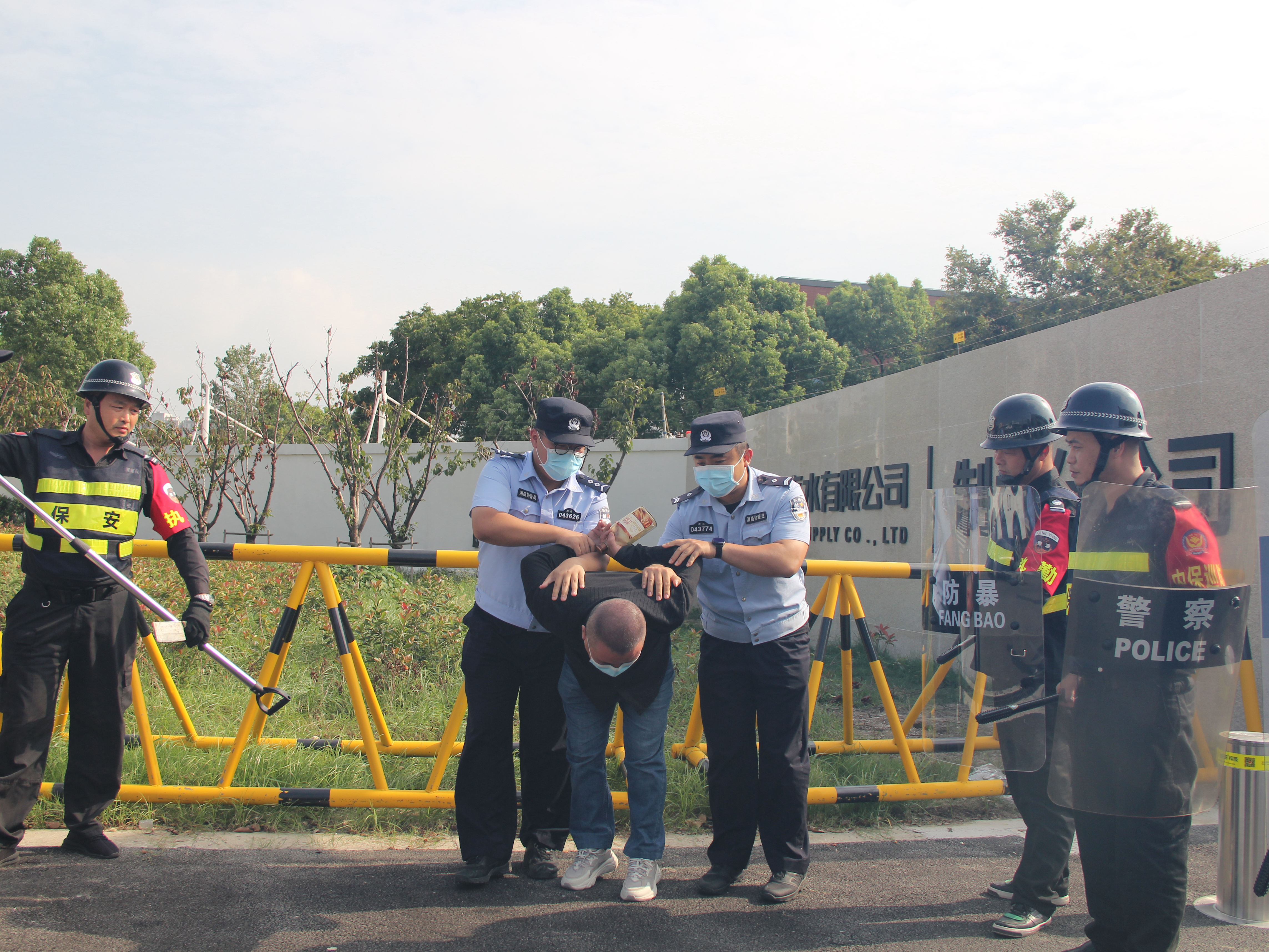 演练前,制水分公司对所有参演安保人员进行了岗位业务技能培训和防暴器材的操作使用训练,并现场组织了一次保安业务知识测试。随后,演练正式开始,一名“醉汉”在白洋湾水厂南门“殴打”过路职工,挥舞着“尖刀”,欲强闯水厂,情况十分危急。保安队长迅速带领三名全副武装的保安人员赶至现场,同时拨打浒关经济技术开发区派出所电话报警。四名保安人员相互配合使用警棍、钢叉及盾牌将这名不明身份的男子逼入空旷地带,疏散周围群众进行警戒,并在分散“醉汉”注意力后将其擒获,有效控制事态发展。随后赶到的浒关经开区派出所警察将“蓄意寻衅肇事者”带至派出所处置。