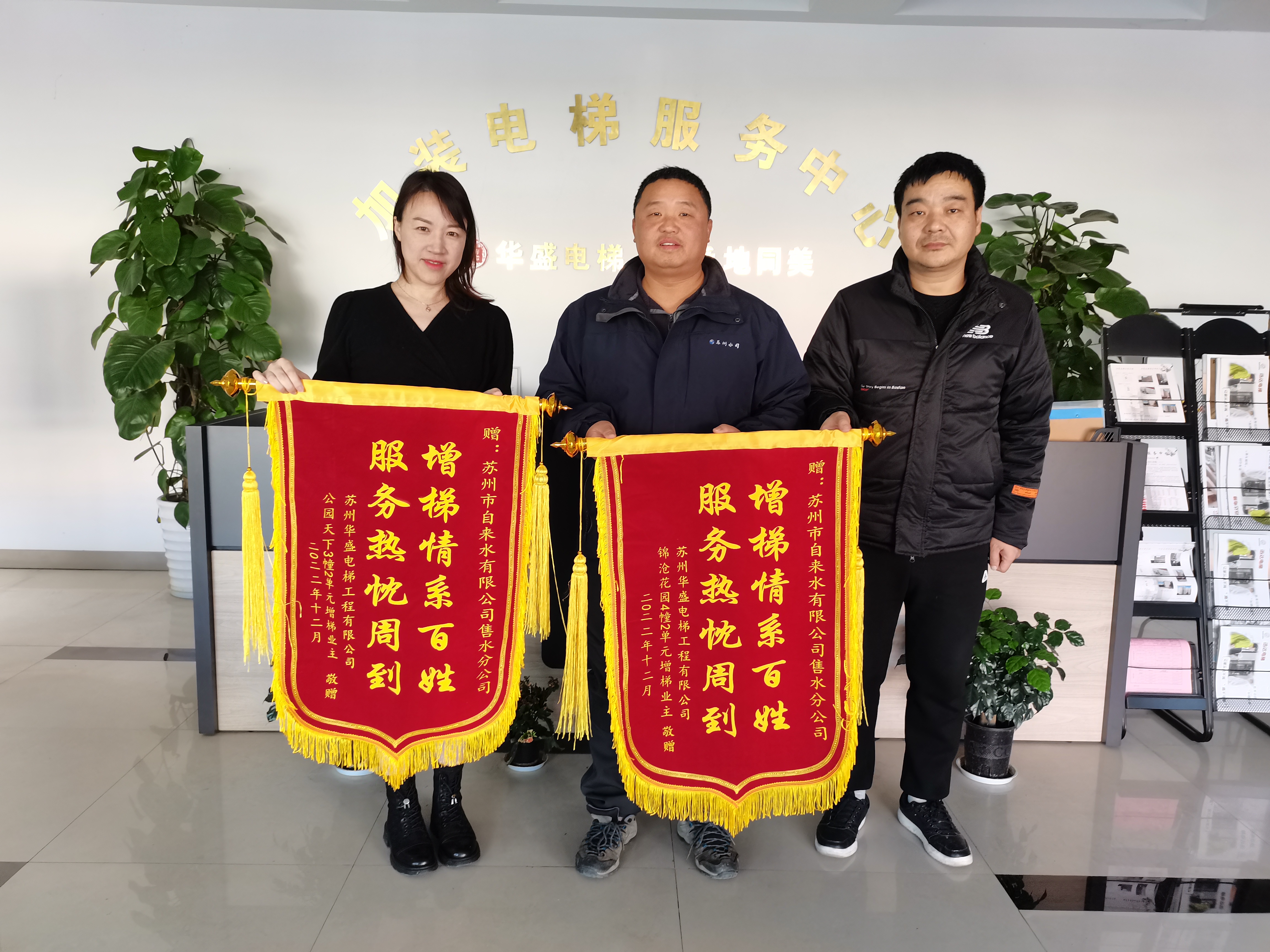 近日,江苏省城市足球赛官网华盛电梯工程有限公司代表与锦沧花园4幢2单元、公园天下3幢2单元的业主代表一同向市自来水公司送来锦旗,以感谢公司积极配合江苏省城市足球赛官网老旧小区增设电梯工作所做出的努力。