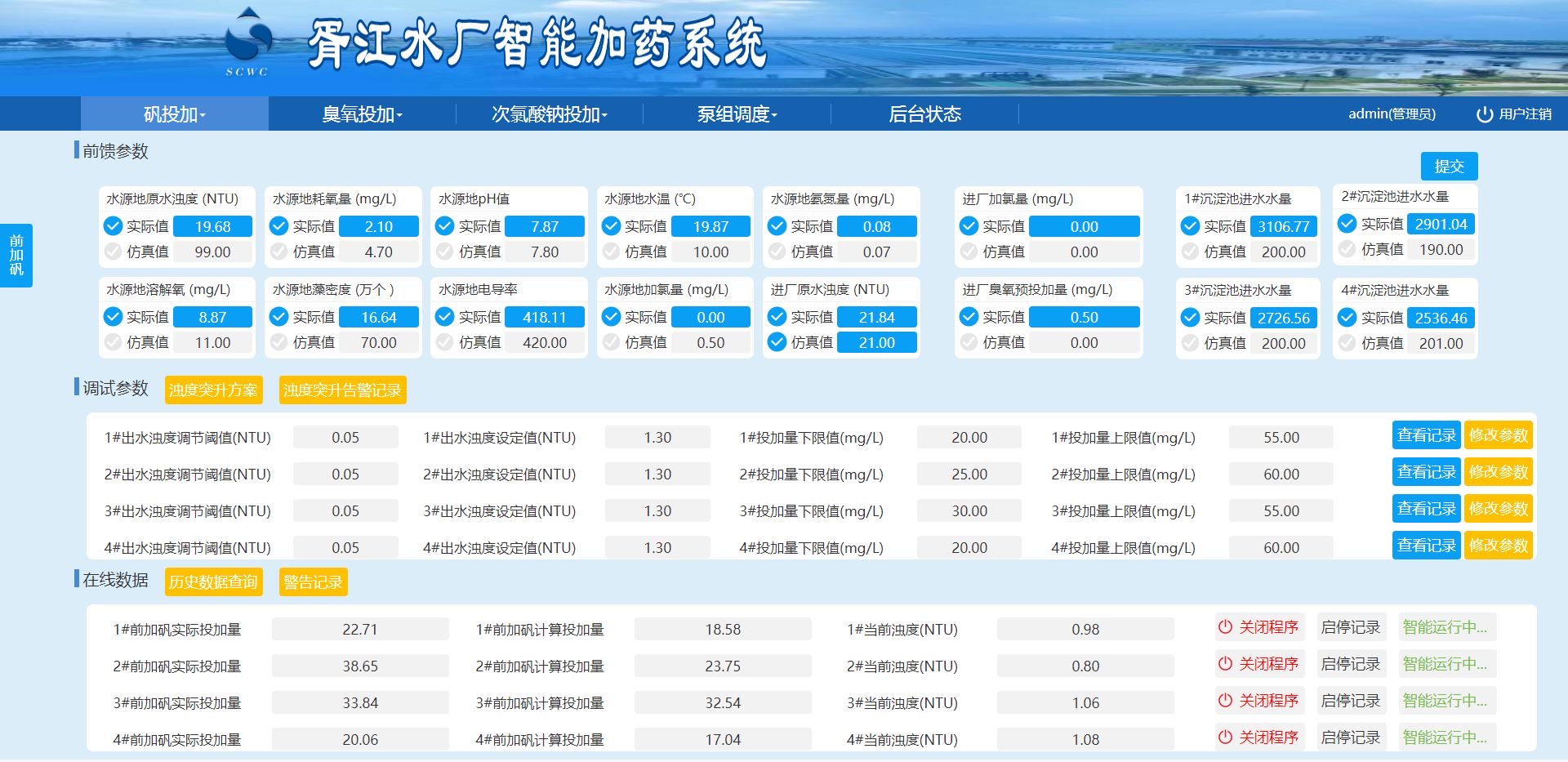 胥江水厂智能加药系统是胥江水厂与南京邮电大学合作进行的基于大数据分析的智能精准加药系统。该系统从投加矾、氯、臭氧三个方面入手,对胥江水厂近10年的生产数据、水质数据进行大数据分析,并结合水厂实际,制定出合理的加药量控制逻辑,从而实现水厂混凝、消毒等制水工艺的准确响应。