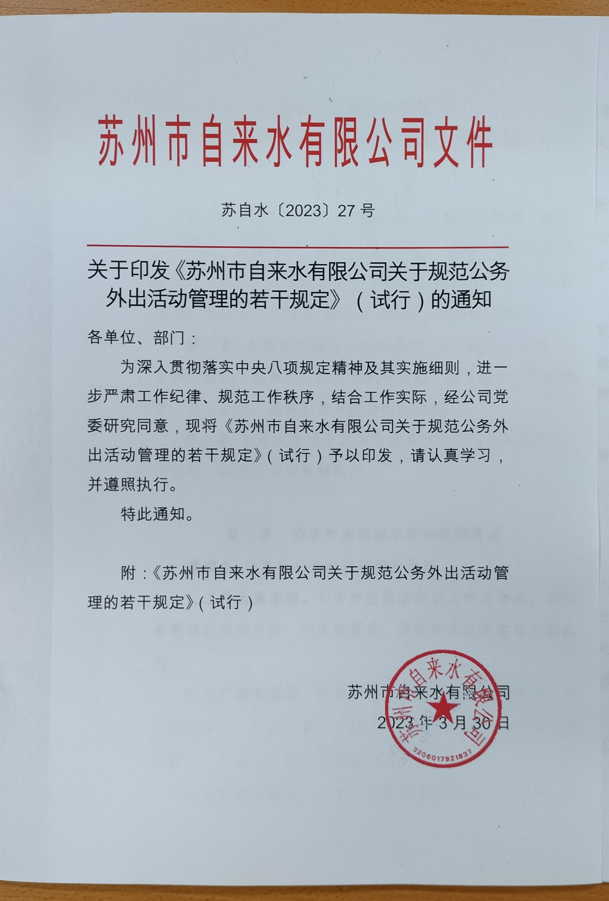 为切实推动完善落实中央八项规定精神的具体措施,把纠治‘四风’实践成果转化为制度规范,市自来水公司结合工作实际,制定印发《江苏省城市足球赛官网关于规范公务外出活动管理的若干规定》(试行),进一步强化和规范公务外出活动管理,防止违规违纪问题发生。