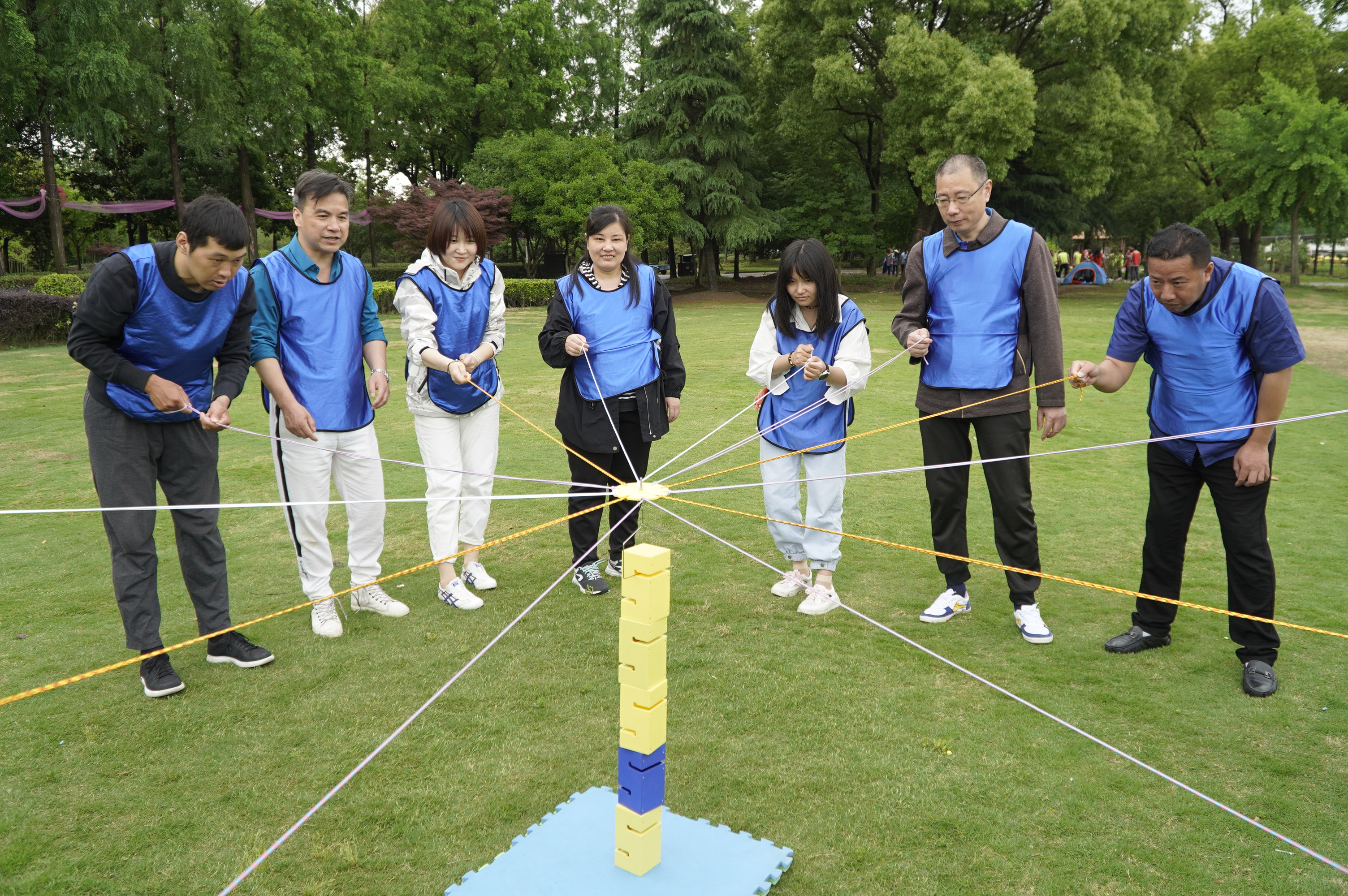 本次团建活动设置了团队活力营、合力建搭、占位巅峰等多个项目。在轻松愉快的氛围中,大家开启了“破冰”热身,迅速融入团建活动当中。按照分组,各队分别起了队名、画了队符,起了响亮的口号,并依次展示了各组风采。全体队员都全身心投入其中,大家互相信任、团结协作、密切配合,不同分组间又相互竞赛,充分激发了团队潜力,展现了各队伍的无限激情与昂扬斗志。