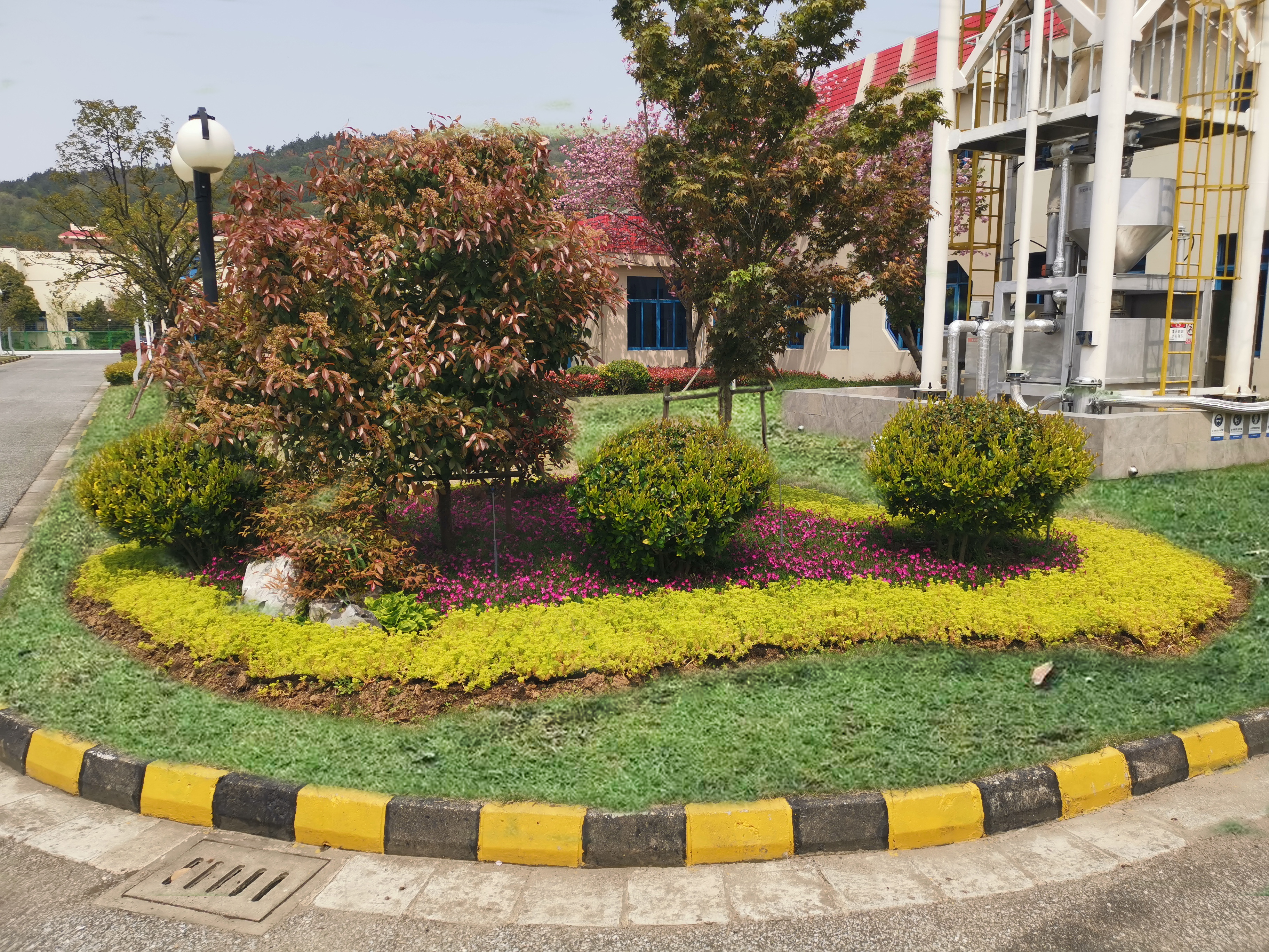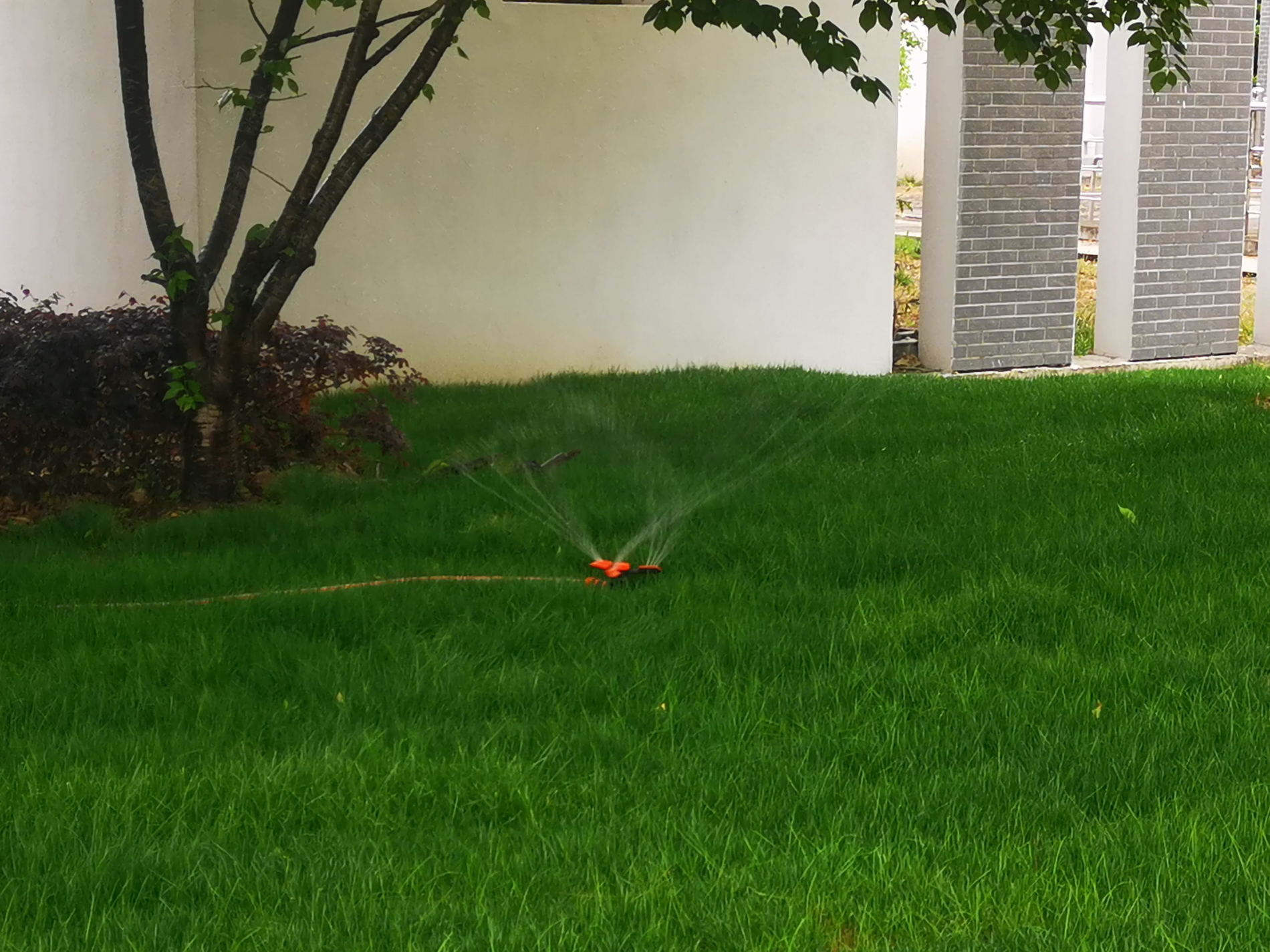 根据胥江水厂现场情况,渔洋山泵房的花镜分别采用了软管明管铺设,安装可移动旋转喷头大面积喷洒,和喷洒水雾均匀、绵密的微喷灌溉的两套方案,既能使土壤长时间保持湿润,又能保证花镜内植物的造型美观。而渔洋山泵房绿地并未预埋喷淋管路,能使用的水源距离也比较远,思源物业借助现有的地下管沟、落水管等设施在不开挖路面、不破坏草坪的情况下铺设暗管,最终让这套灌溉系统顺利贯通。