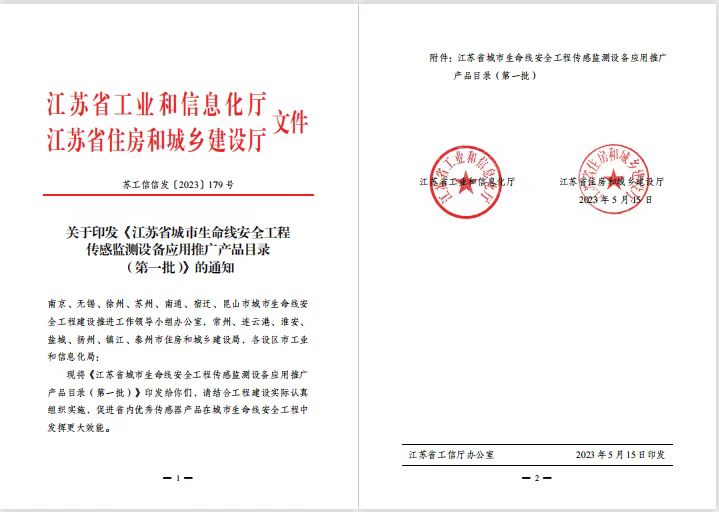 近日,江苏省工业和信息化厅、江苏省住房和城乡建设厅对下发的《江苏省城市生命线安全工程传感监测设备应用推广产品目录(第一批)》文件进行了公示,表业公司共计有14款产品成功入围。