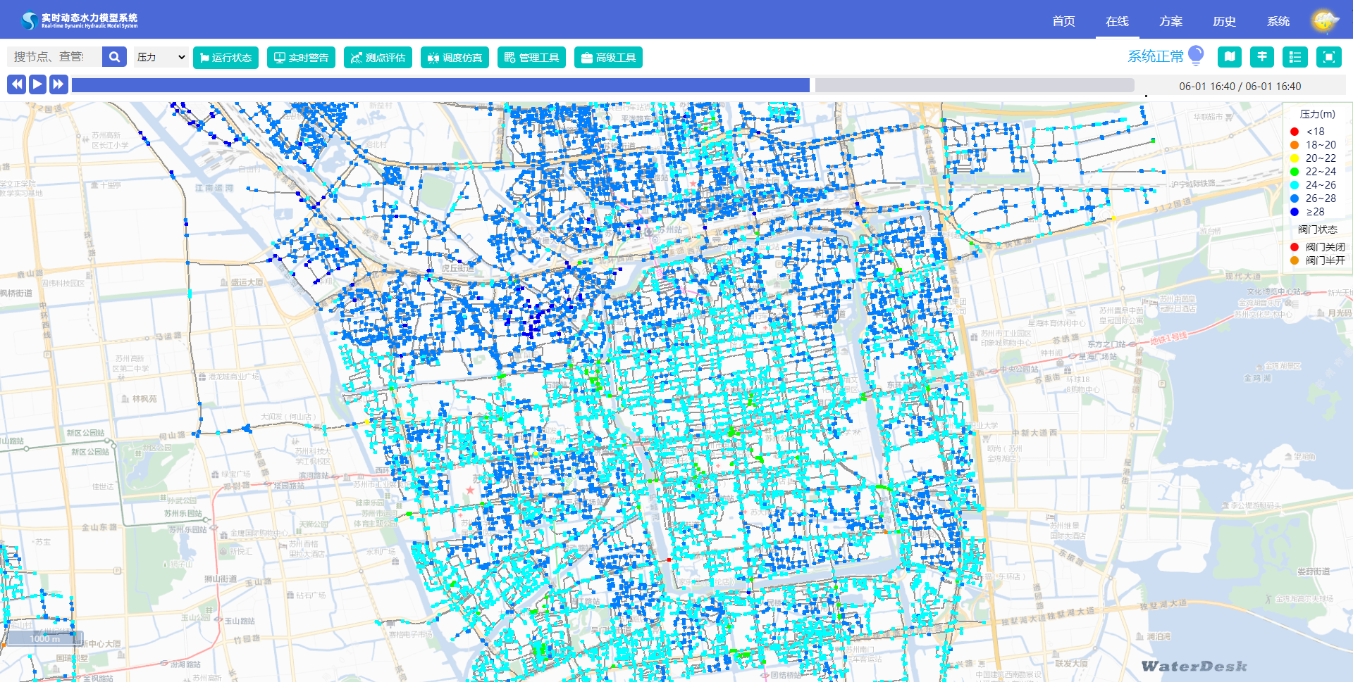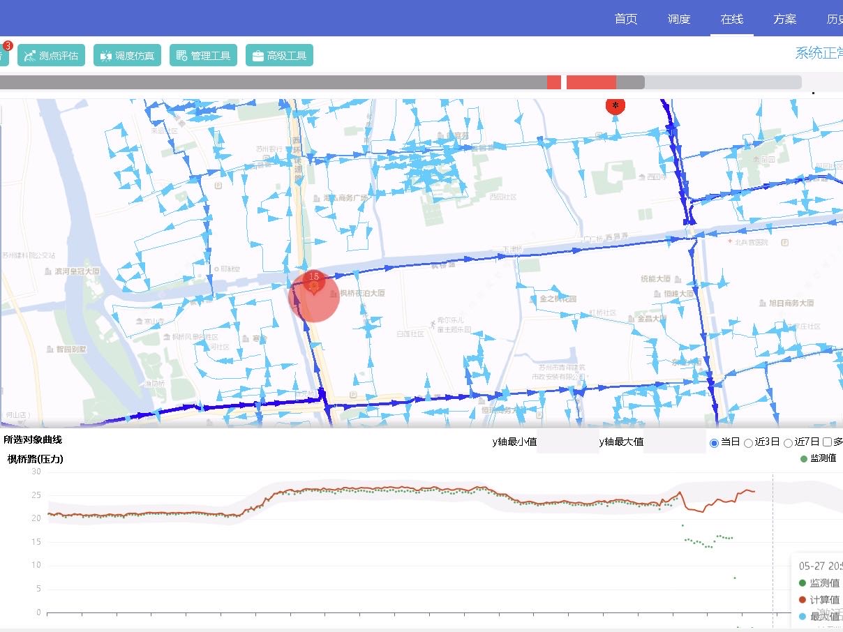 在线水力模型通过对管网运行状态的实时监测和模拟,实现了供水系统的智慧化监控,具备大型工程方案模拟、污染物溯源、泵站调度优化、管道流向流速模拟、管道水龄模拟、供水分界面判定、爆管警报等多种功能,为公司重要供水设施(如市政增压泵房)建设、重要新建管道口径确定、大口径管道迁改、分区计量、管网在线监测点优化等决策提供了强有力的技术支撑。