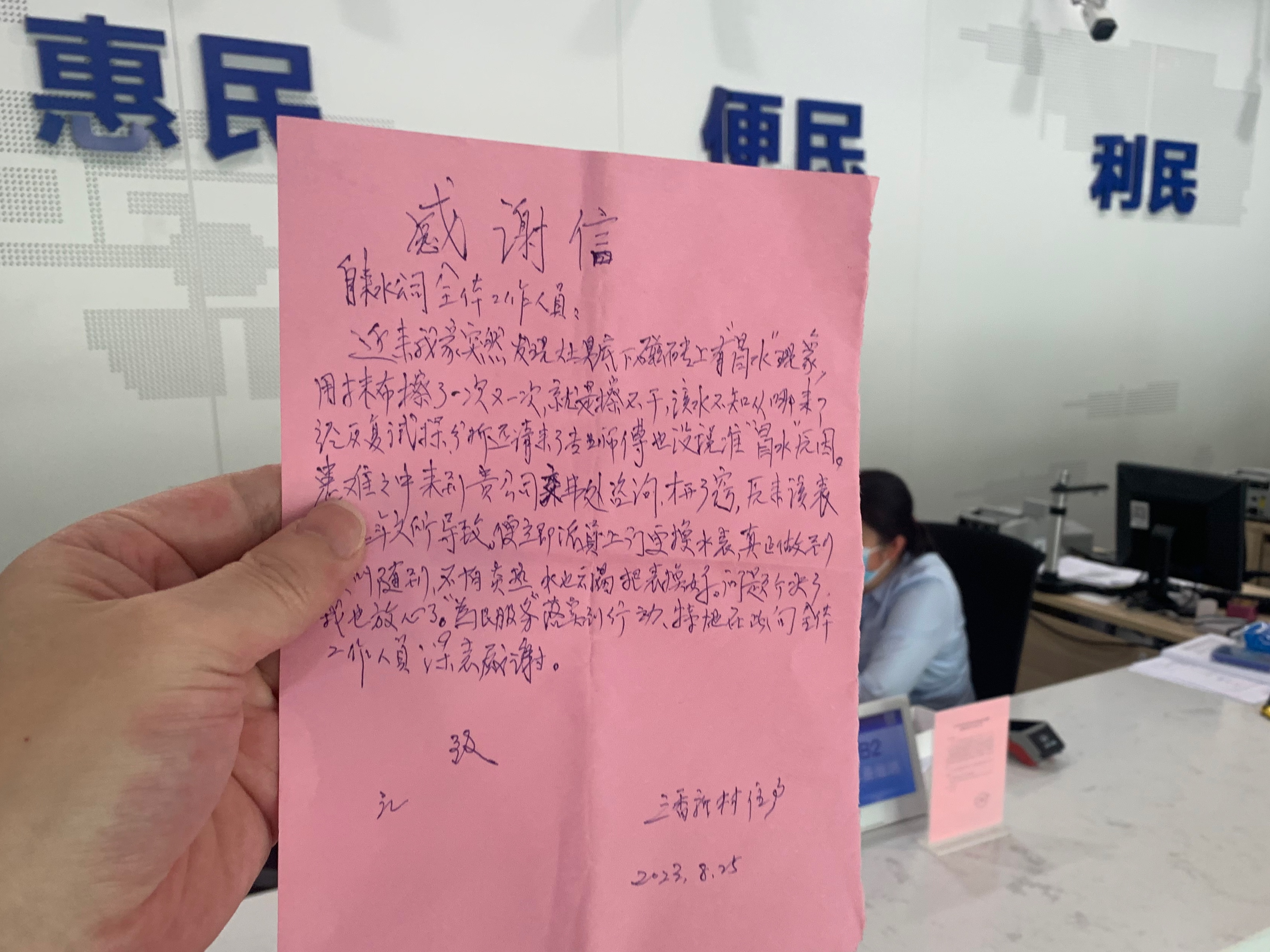 近日,家住三香新村一位老人冒着酷暑来到供水营业厅,送来了一封亲手书写的感谢信,对公司工作人员热情的服务和敬业的工作态度表示感谢。