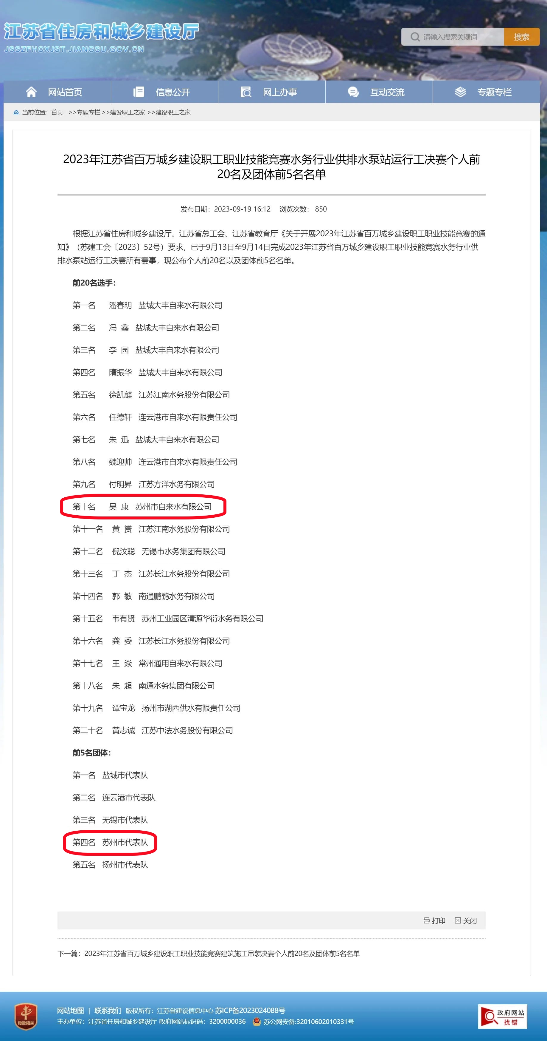 近日,2023年江苏省百万城乡建设职工职业技能竞赛水务行业供排水泵站运行工决赛在扬州市成功举办,江苏省城市足球赛官网市代表队荣获团体第四名的佳绩,江苏省城市足球赛官网职工吴康荣获个人第十名。