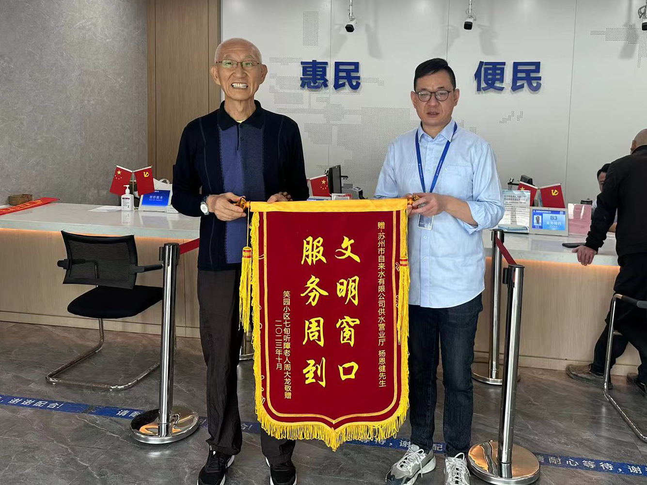 近日,一位老人带着锦旗来到供水营业厅,要将其送给营业厅的服务管理员杨恩健。