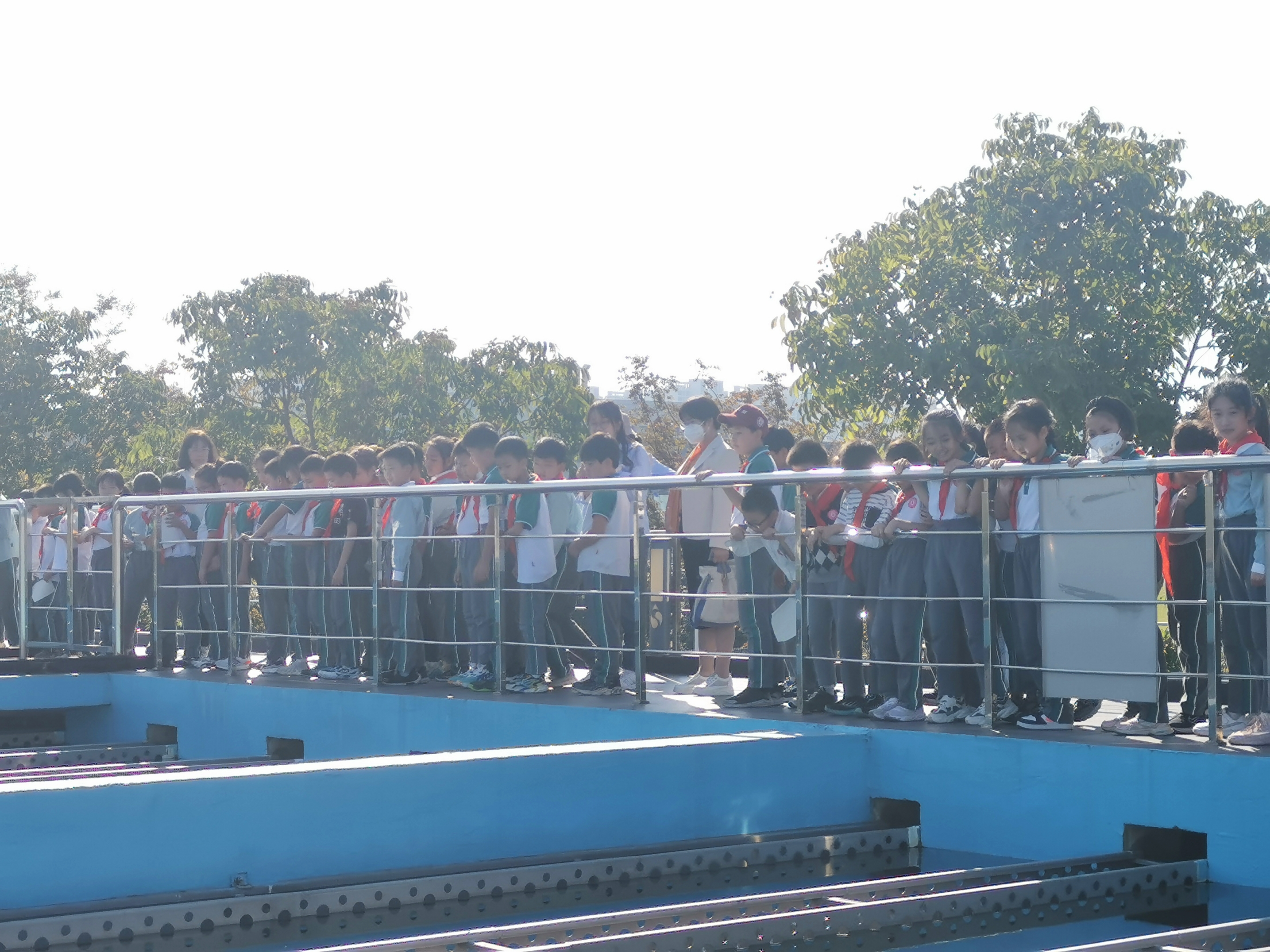 同学们跟随讲解员的脚步,依次参观了相城水厂的沉淀池、砂滤池及炭滤池。结合运行管理实际,讲解员深入浅出地为同学们介绍了水厂生产工艺以及净水构筑物和设备的运行情况。大家认真听讲,了解从“源头”到“龙头”的制水工艺过程,并仔细记录下各个水处理知识点,还就制水工艺的相关问题进行提问,讲解员一一为大家做了详细回答。