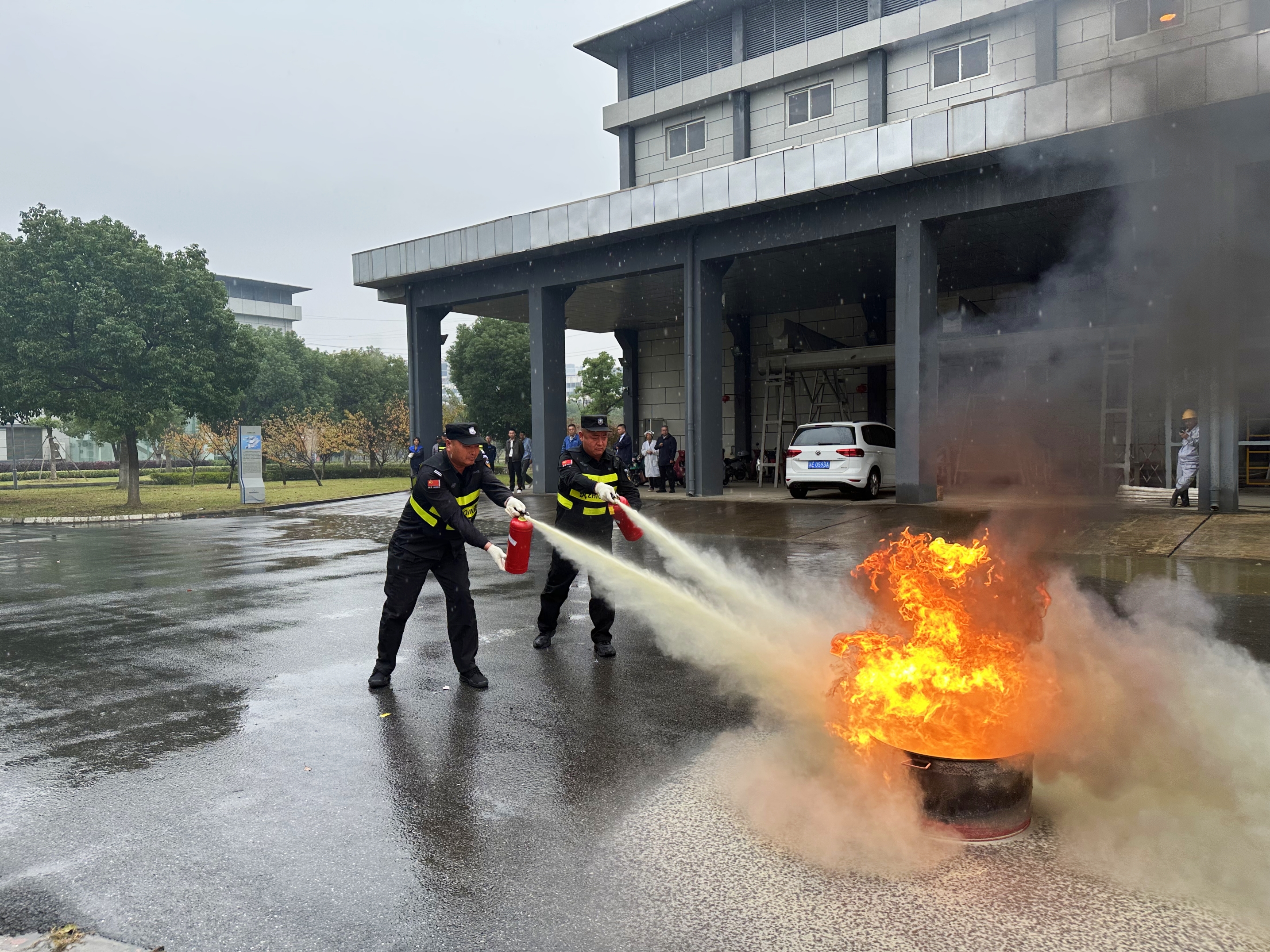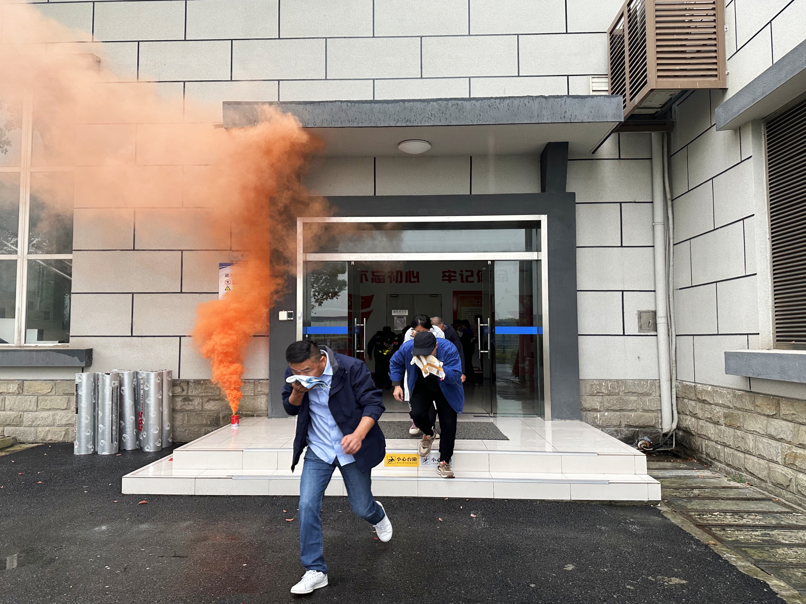 演练前夕,参演人员集中观看了“火灾案例警示教育片”,安全员对大家进行消防安全知识的普及。培训结束后,相城水厂中控室一楼大厅内响起消防演习烟雾的警报声,逃生演练正式开始。大厅负责人第一时间到岗,协助指挥职工队伍疏散撤离,大家按照要求弯腰弓身,用毛巾捂着口鼻快速撤离到安全区域,整个“逃离”过程井然有序。随后,参演队伍在消防维保专业人员的指导下开展灭火演练,各灭火小组迅速进入状态,手持干粉灭火器精准扑灭火焰。