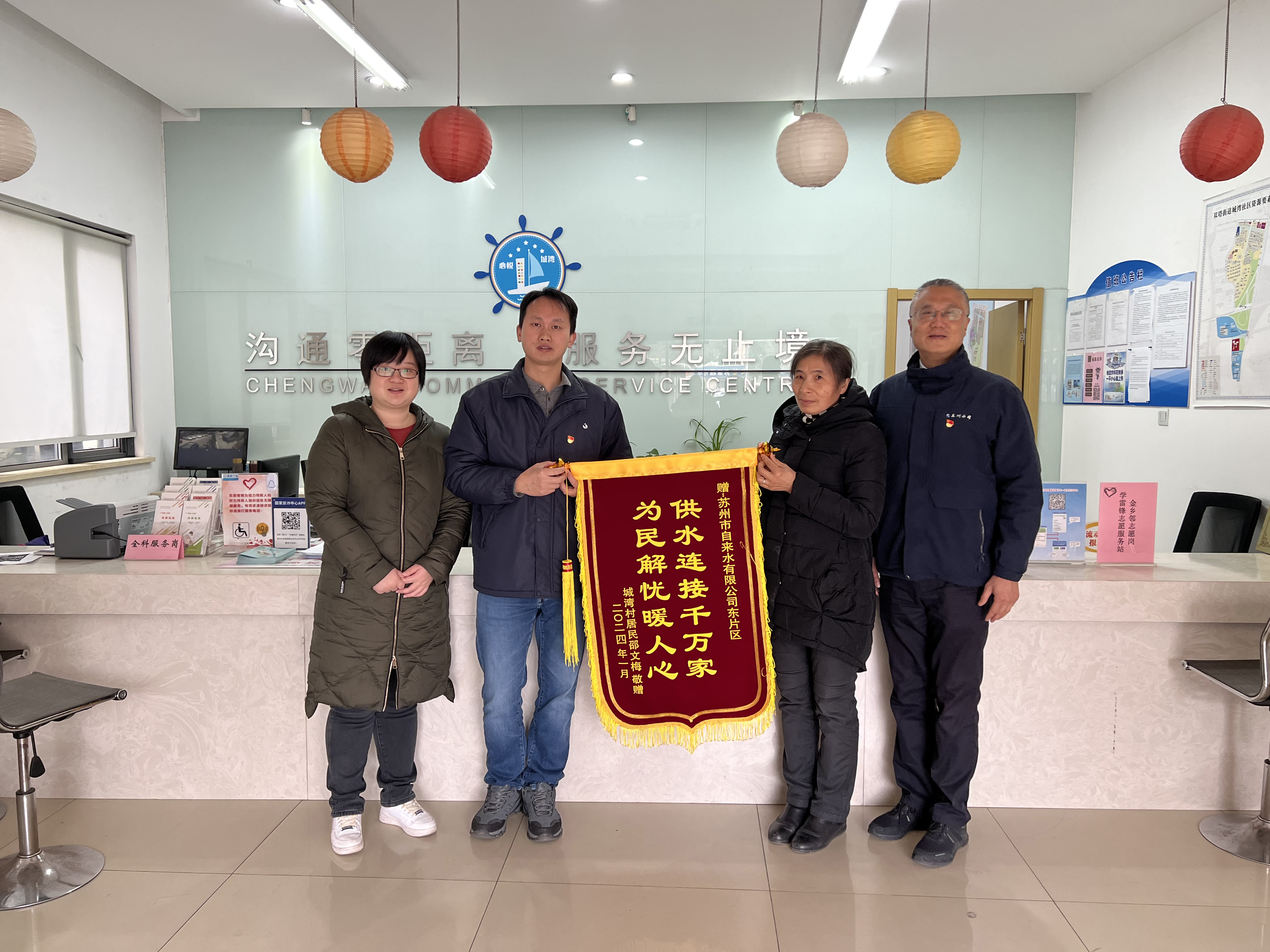 1月8日,城湾村居民邵文梅将一面写有“供水连接千万家,为民解忧暖人心”的锦旗赠予公司,为片区工作人员切实为群众办实事、解民忧的高质量服务表示诚挚的感谢。