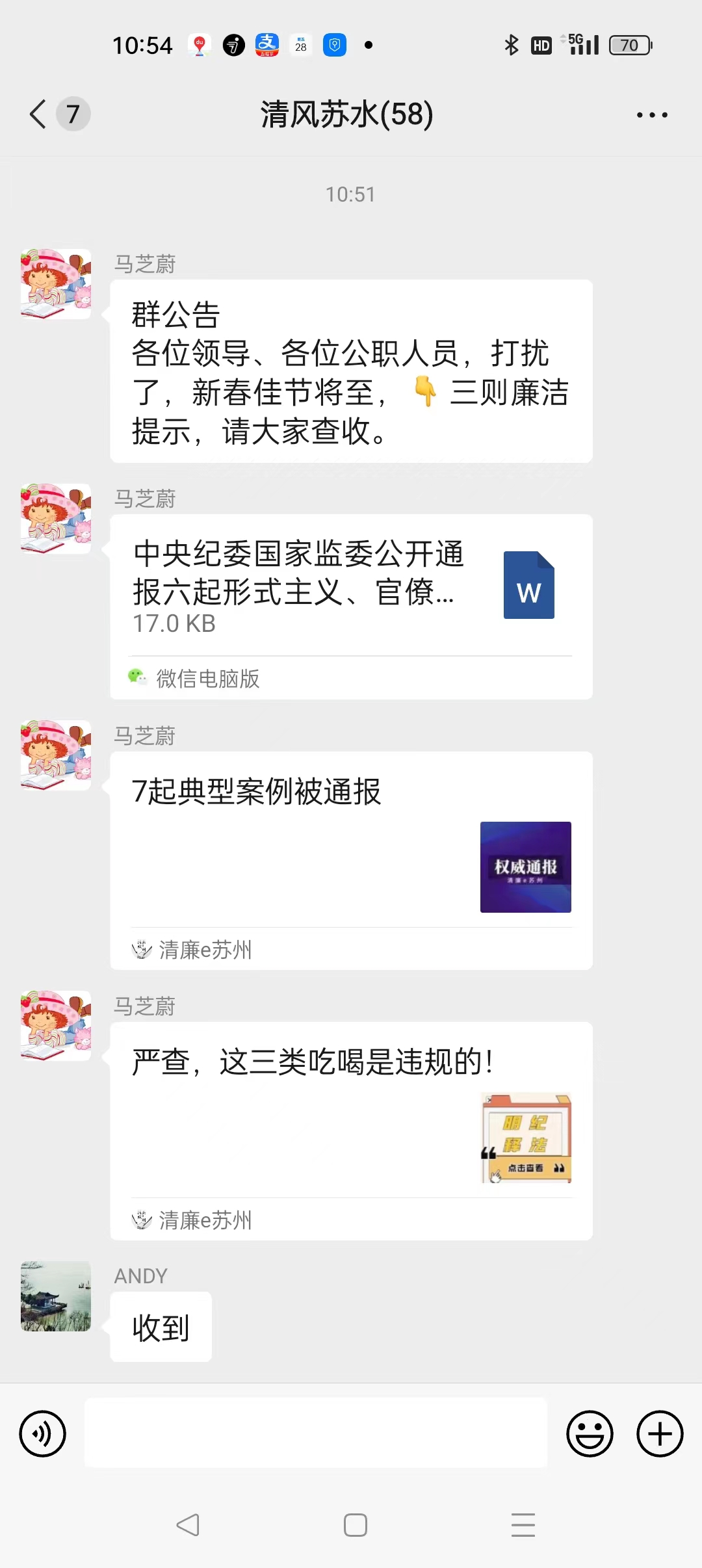 发送廉洁短信,营造清廉氛围。在双节来临之际,公司纪委通过“清风苏水”微信群发送廉政短信,及时给全体干部职工吹清风、敲警钟、鸣警笛,将“指尖上的廉洁提醒”变为常态化,进一步增强了廉政教育的渗透力。