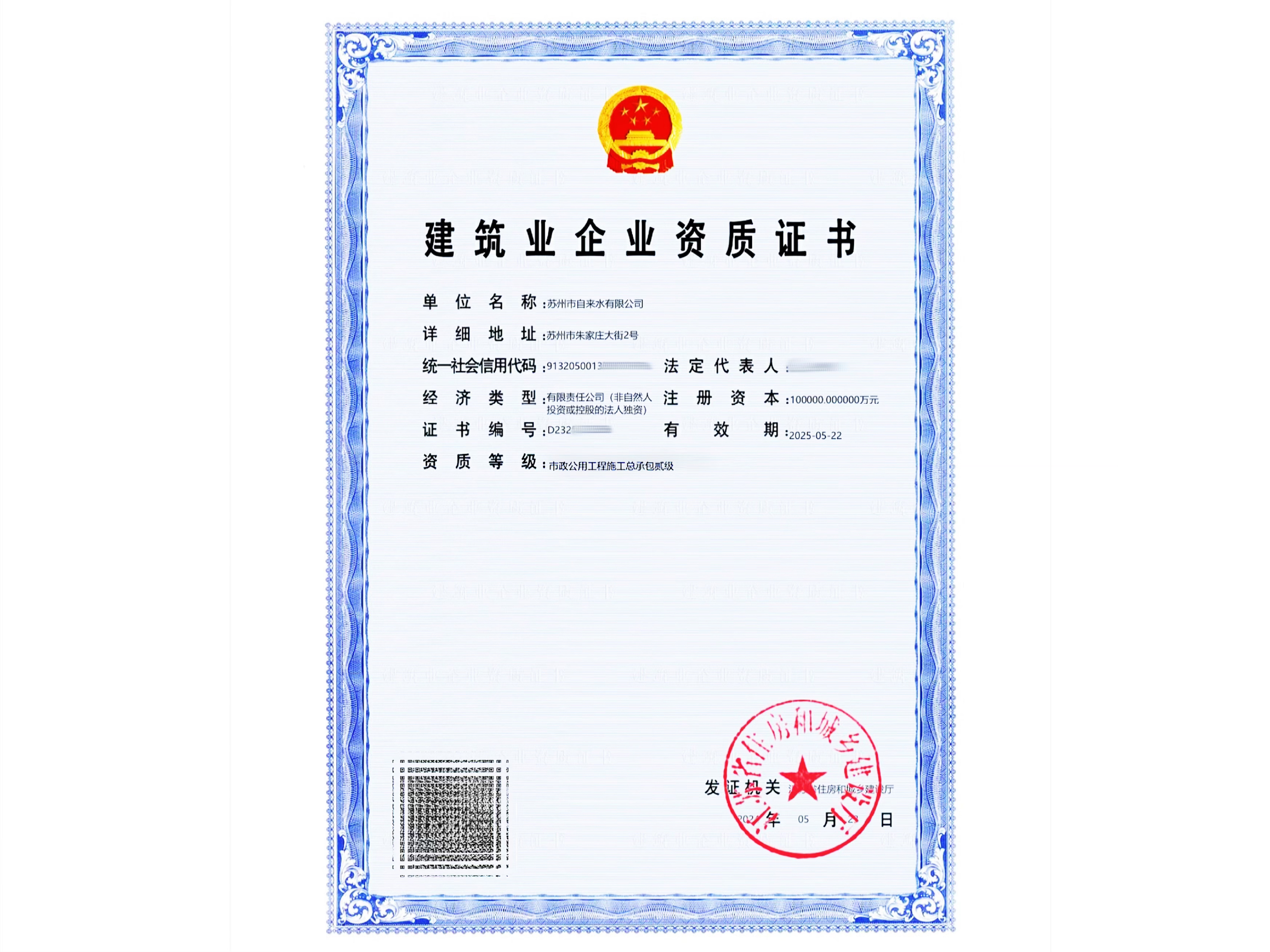 近日,公司完成建设工程企业资质证书换领工作,经资质主管部门核准,成功取得市政公用工程施工总承包贰级资质。