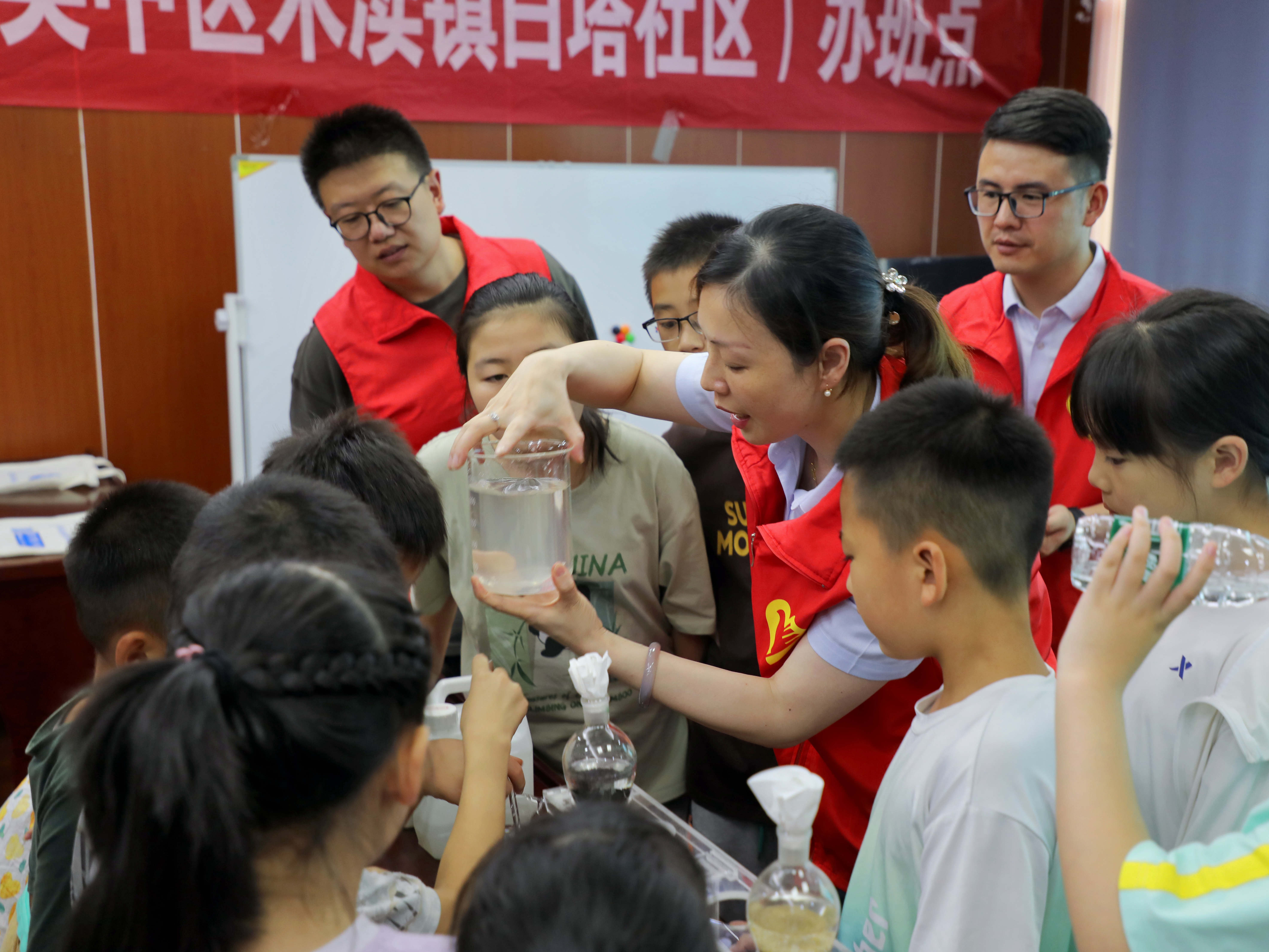 “水真的变清澈啦,好神奇呀!”社区的青少年活动中心里,孩子们目不转睛地盯着实验器具,发出一声声感叹。