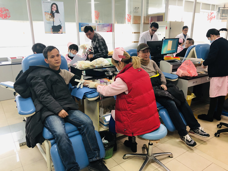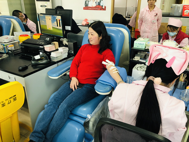 在现场,等待检验和献血的职工坐满了等候区。献血大厅里气氛轻松活泼,志愿者们谈笑风生,有分享自己的献血趣事的,也有闲聊打趣的,欢声笑语有效地缓解了初次参加献血者的紧张心情。