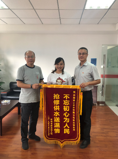 8月20日下午,新沧花园幼儿园的两位负责人,将一面书有 “不忘初心为人民,抢修供水送温情”的锦旗送至供水营业所,感谢延伸服务部门在6月27日的迅速反应与全力抢修。