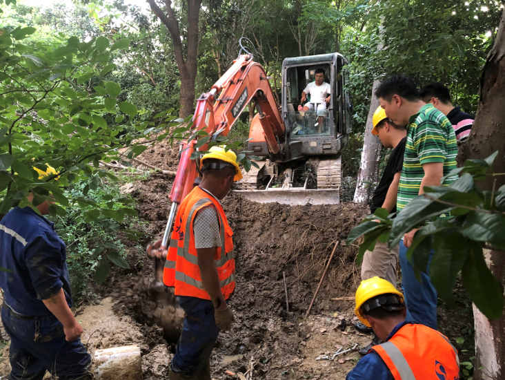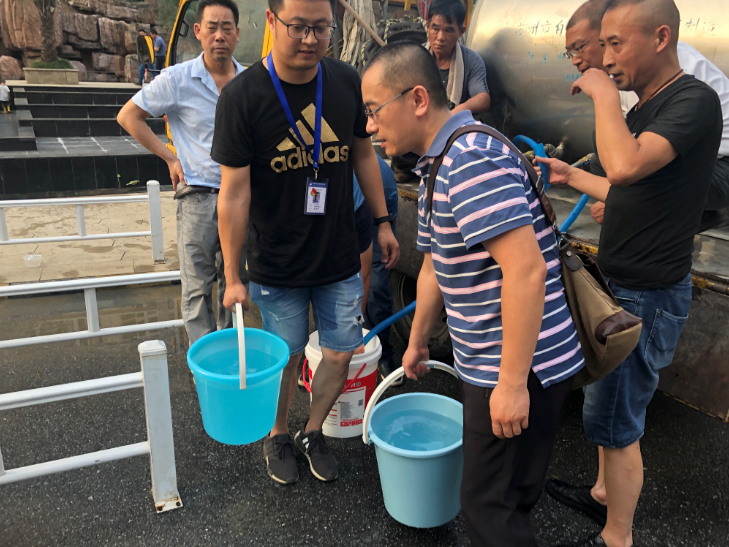 经工作人员现场查勘,确认漏点位于小区景观带内,由于回填土质松软,操作空间小,给受损管道抢修增添了不少难度,但抢修人员冒着高温,努力奋战。一边是紧急施工现场,一边是志愿服务者在奔忙——考虑到此次突发停水适逢高峰用水时段,为减少对业主们日常生活的影响,公司立即行动,派出供水车奔赴现场及时送水;两所党员志愿者们也在第一时间赶往小区为居民发放桶装矿泉水,并积极跟进管道维修进度,向业主们做好安抚解释工作,并对只有老人和小孩在家的住户优先送水上门,得到了用户的肯定和理解,彰显了党员的先锋模范作用。