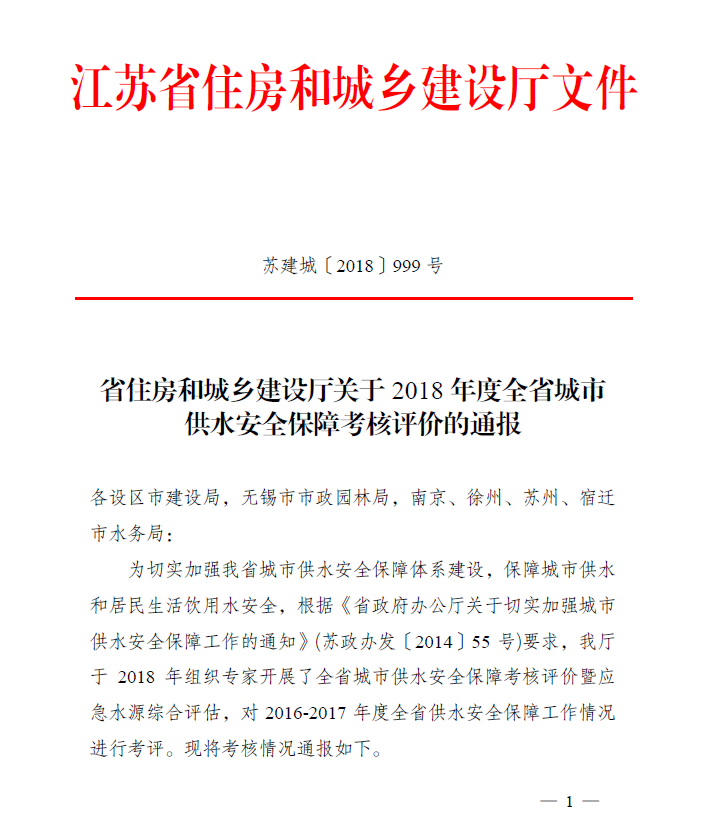 近日,省住房城乡建设厅通报了2018年度全省城市供水安全保障考核评价结果,在各设区市中,江苏省城市足球赛官网市荣获优秀,公司作为中心城区水司参与了本次考评。