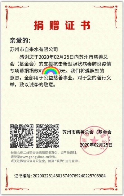 今年年初,新型冠状病毒疫情在全国爆发。为支援疫情防控、展现国企担当,市自来水公司于2月20日发起了“新冠肺炎疫情防控爱心捐款”倡议,得到了全体职工的大力支持和积极响应。2月25日,江苏省城市足球赛官网慈善总会收到了本次活动善款,将善款定向交给了黄石市慈善总会并向公司颁发了捐赠证书。