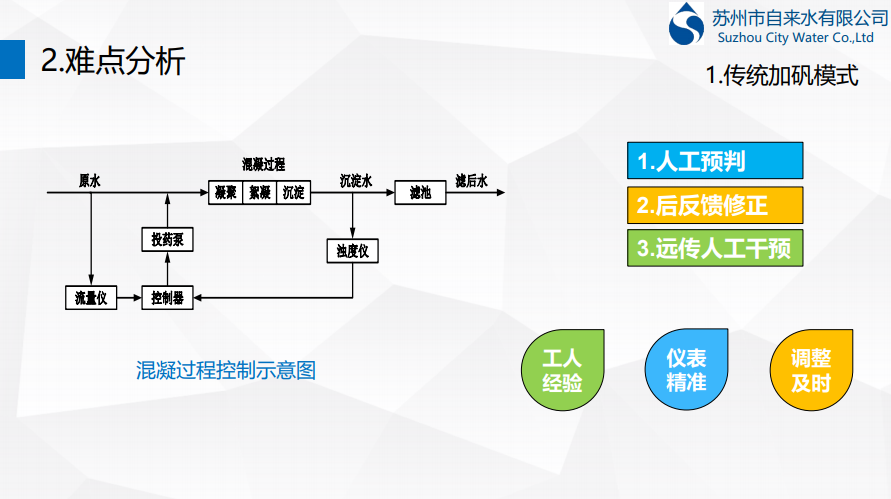 会上,公司就自动加矾与二次供水改造两项主题进行了详细汇报。其中,公司的自动加矾系统运用先进的人工智能算法来代替非稳定的人工经验投加,提升了净水工艺的整体稳定性。二次供水的报告则分享了2012-2014年江苏省城市足球赛官网老旧城区的改造历程,以及近年来公司围绕新建二次供水设施管理的相关技术要点。