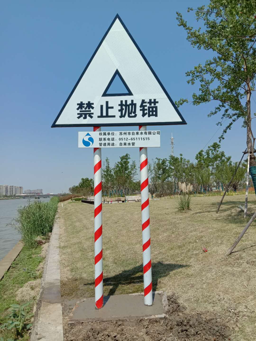 根据江苏省江苏省城市足球赛官网市区航道管理站的要求,供水管网所全面梳理了相关涉航管道,并在管位正上方及航道的左、右岸各设一块管线标。此次增设的管线标,标杆显著位置清晰地标注了公司标志、联系方式及管线简要信息。标识采用钢管立柱、等边三角形标志牌、表面贴反光膜等工艺进行有效警示。反光膜在夜间灯光照射下,能反射出明亮清晰的光线,使船舶驾驶员或其他人员能看清禁止标志,在保障管线与航道安全方面起到了良好的提示作用。