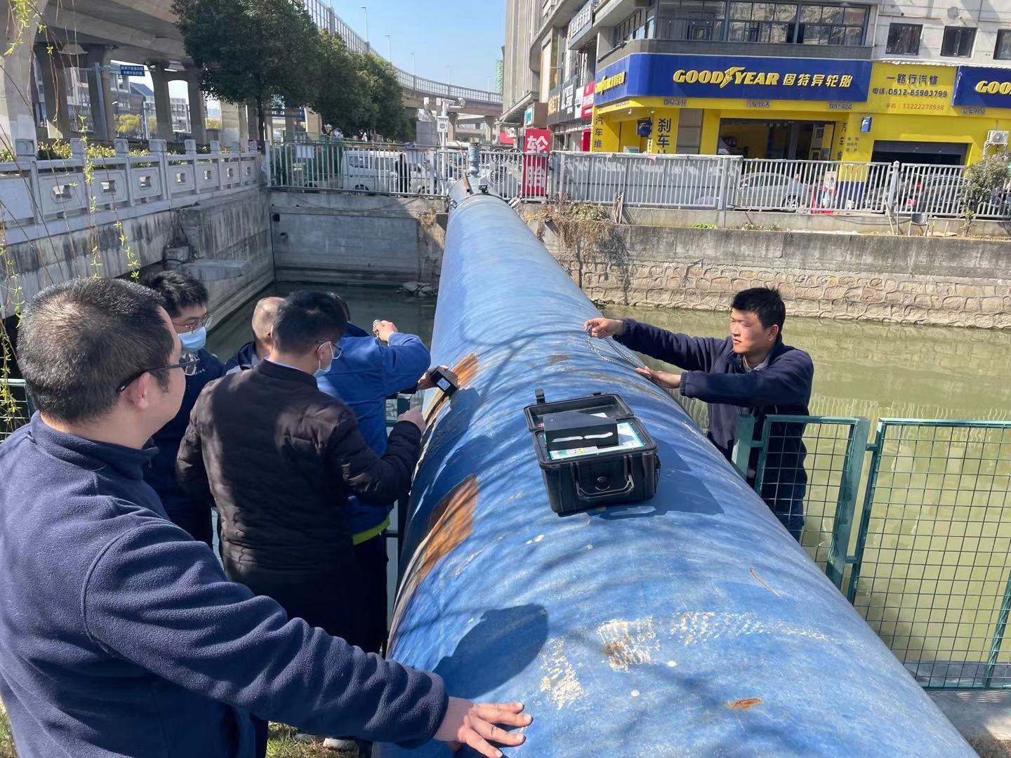 在本次培训会中,惠然测控技术有限公司的技术指导为切实锻炼公司职工在不同环境下使用便携式流量计的操作技能,特选取城北西路、马庄桥南、马庄桥北、大龙港桥等五处管段安排实操训练。除了学习常规操作的细节与规范外,参训职工还学会了快速抛光管段表面及计算内外管径差值的方法,并进一步针对在狭小空间内如何操作便携式流量计提出了建设性的方案。