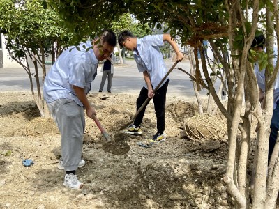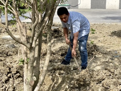 在专业园艺工的指导下,团员青年分工协作,在水厂污泥料仓旁的绿化带进行除草、松土、挖坑、植树、培土、浇水等多个步骤。尽管气温仍然居高不下,但大家的干劲却丝毫不减。经过一上午的辛勤劳动,原本荒芜的绿化带在桂树的装点下变得更加美观、整洁。